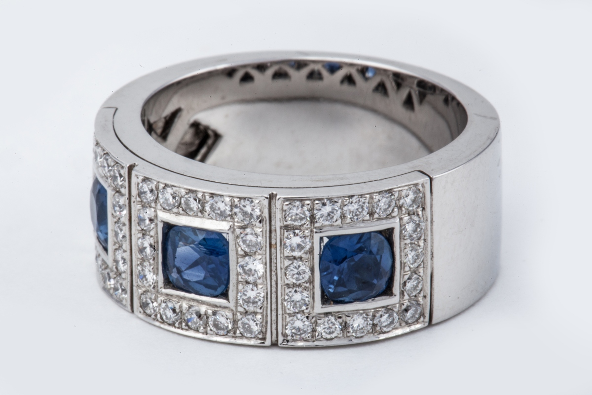 BAGUE bandeau en or gris, sertie de trois saphirs dans un pavage de diamants.