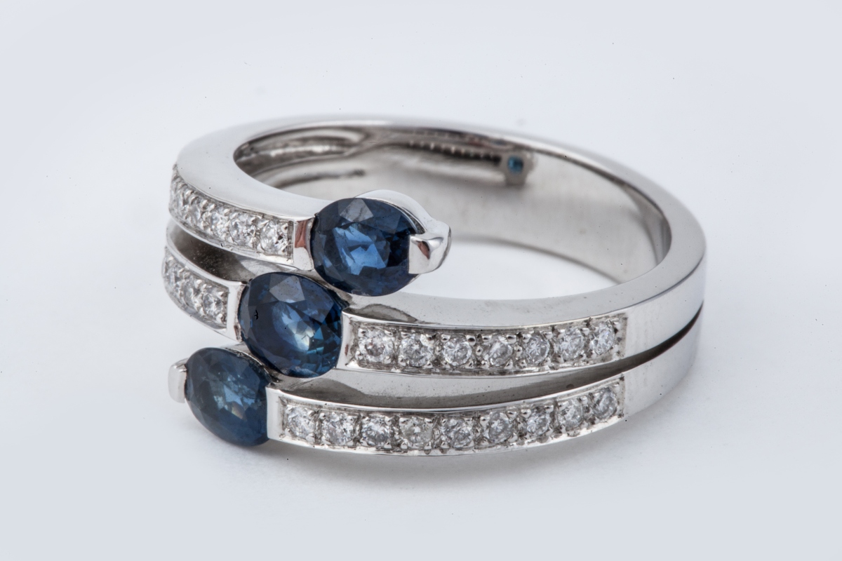 BAGUE en or gris, sertie de trois saphirs de forme ovale entre des lignes de diamants.