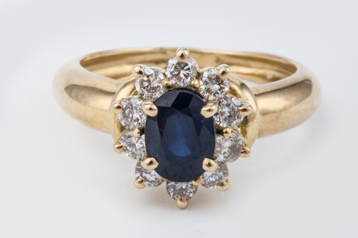 BAGUE en or jaune, sertie d'un saphir de forme ovale dans un entourage de petits diamants.