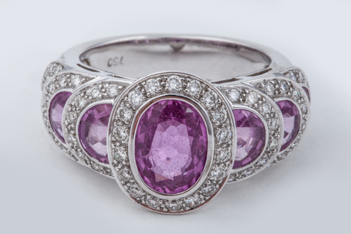 BAGUE en or gris, sertie de saphirs roses de forme ovale et demi lune dans des entourages de diamants.