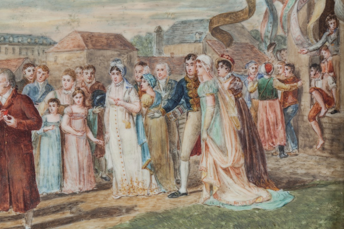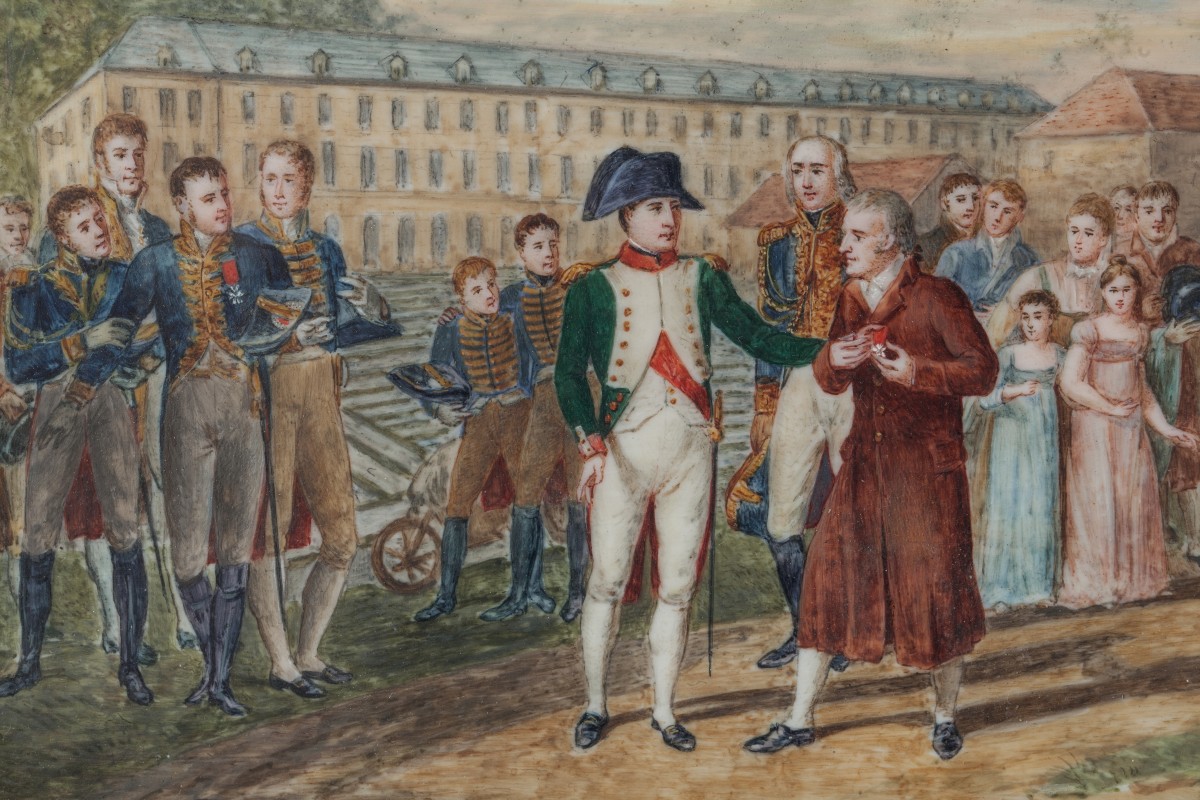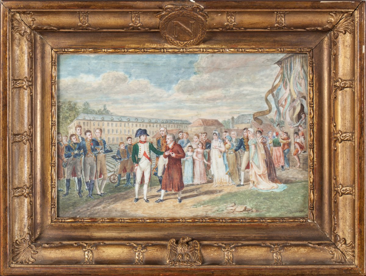 Pietro MANCION. Emperor Napoleon granting the Legion of Honor to Oberkampf. Gouache in a rich, gilded frame decorated with the Imperial eagle and the N.