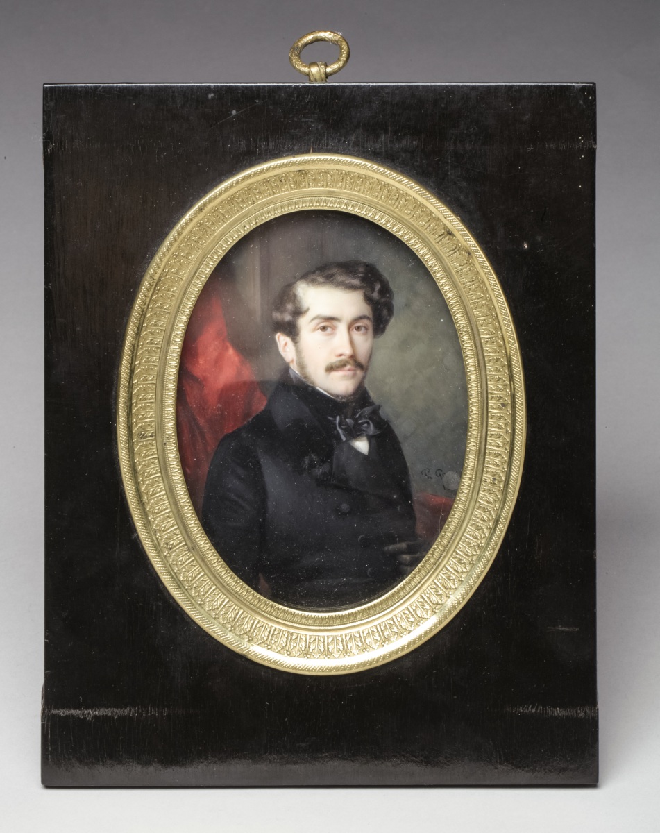 Paul GOMIEN. Pair of MINIATURE PORTRAITS. Portrait of a man in Turkish costume. Portrait of a man in a frock coat. Signed and dated 1827. Conserved in their original ebony and bronze frames.
