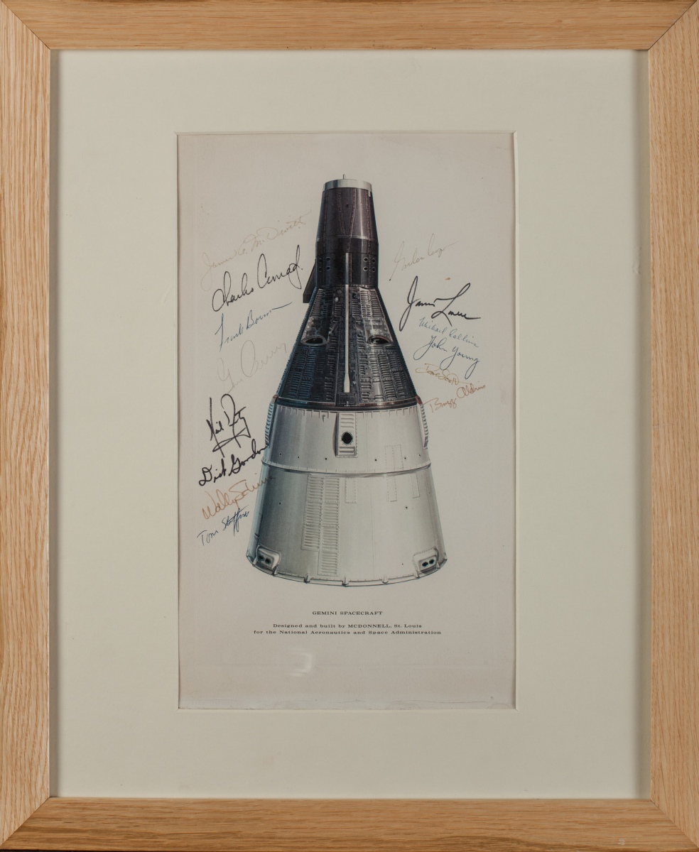 Gravure en couleurs "Gemini spacecraft. Designed aud built by Mcdonnel, St. Louis for the National Aeronautics and Space Administration" - comportant 14 signatures d'astronautes.