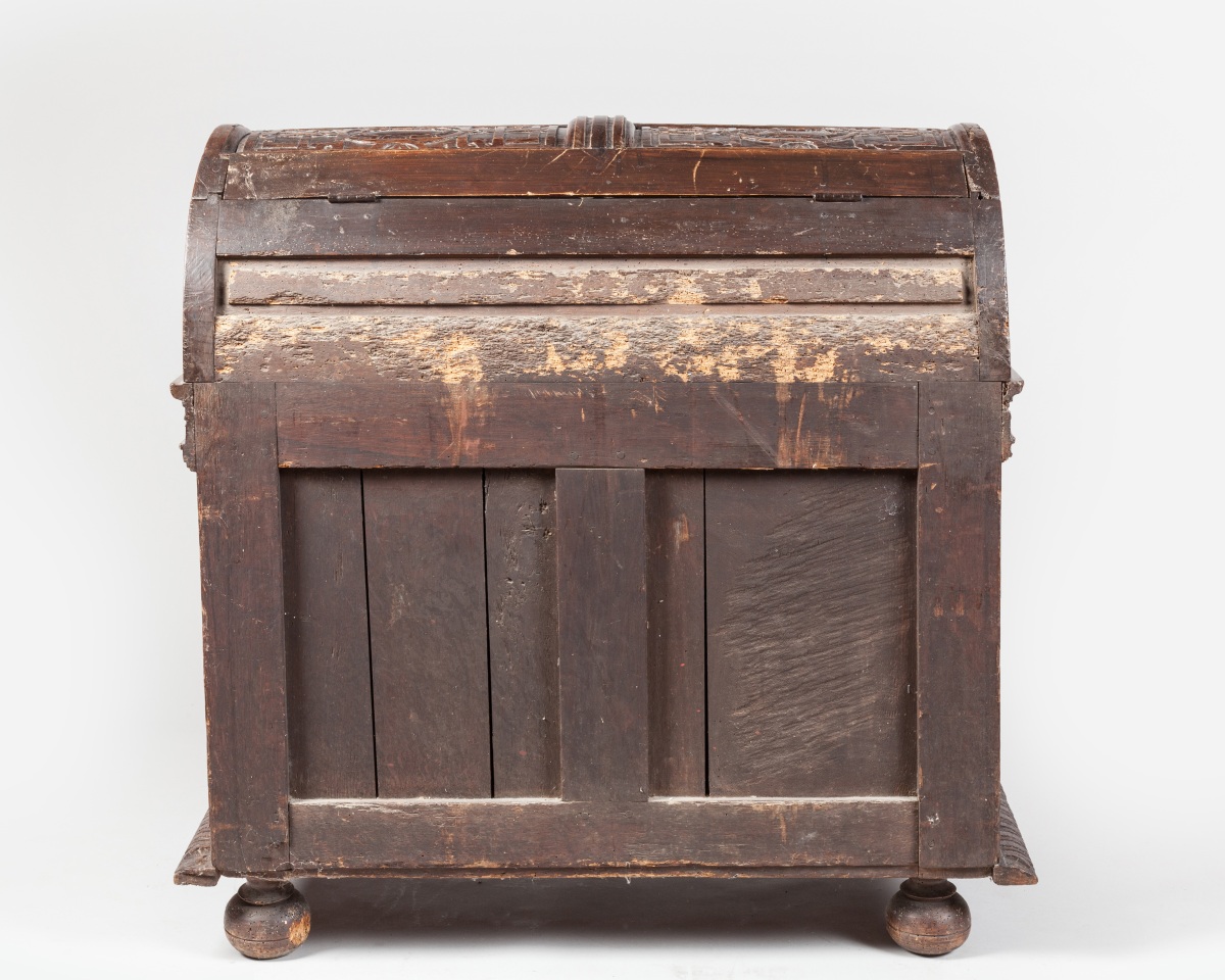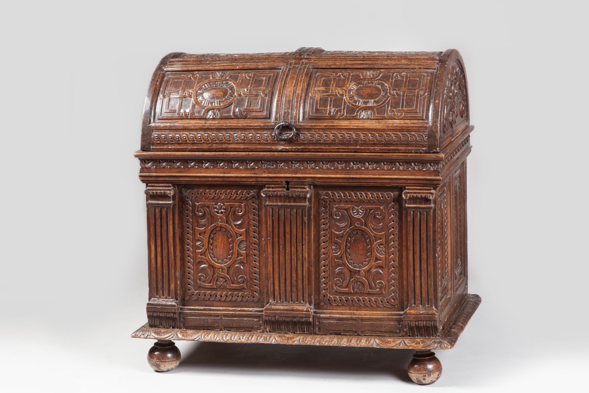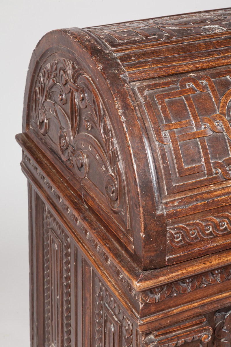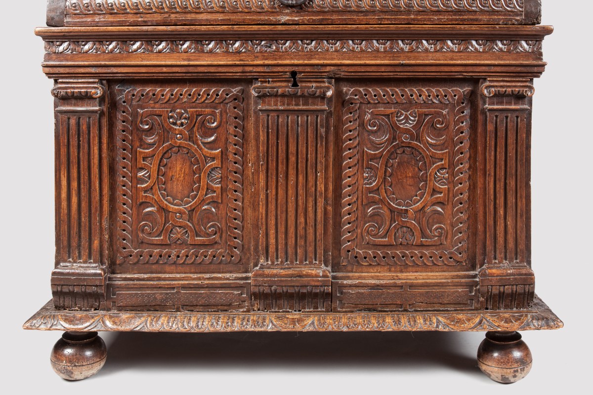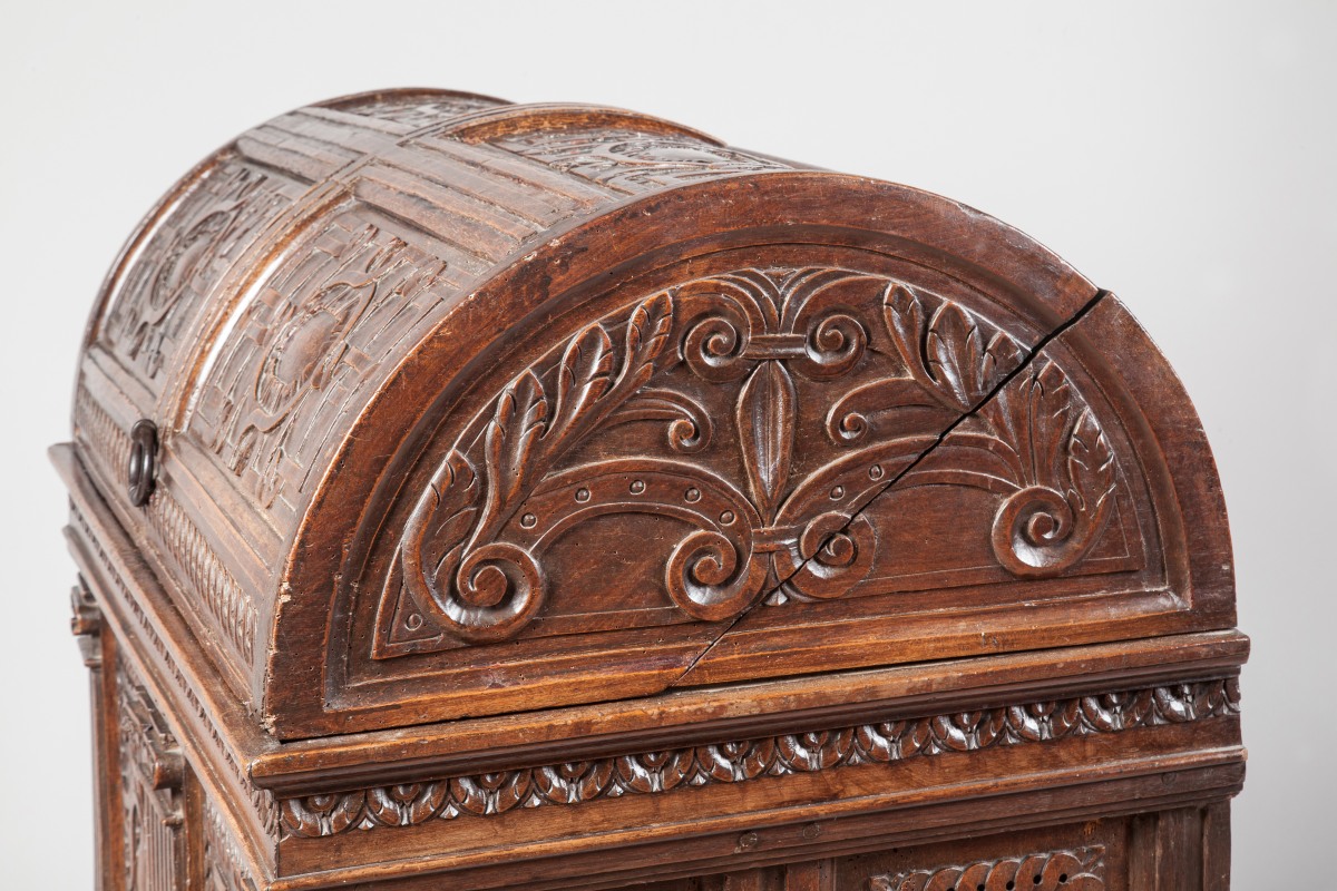 "MARIAGE CHEST". Natural sculpted and moulded wood. Ancient Renaissance work with some restorations. From the former collection of the Chaumont castle.