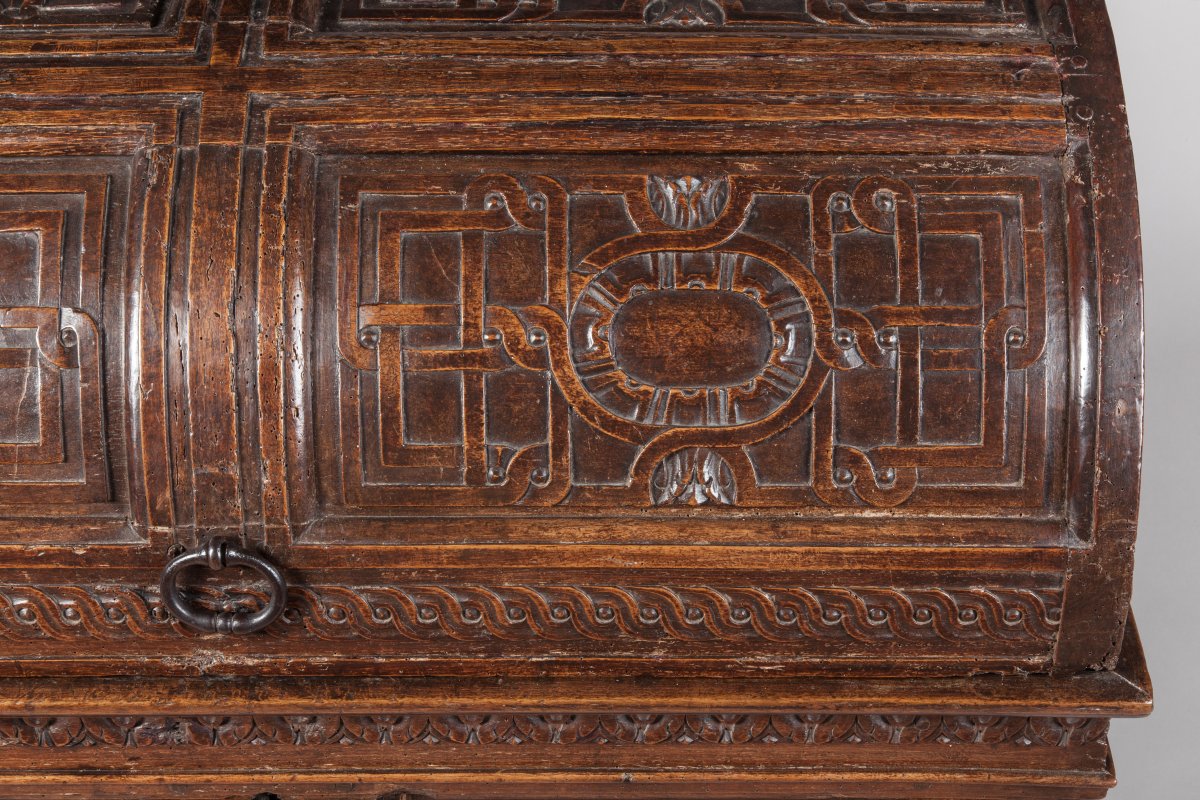 COFFRE dit de MARIAGE en bois naturel mouluré et sculpté. Façade à colonnes architecturées, scandant des panneaux à entrelacs et oves. Le dessus bombé présente une ornementation sculptée de rubans en cuir découpé, et de médaillons en oves. Le demi-circulaire sur les côtés présente une fleur de lys stylisée.