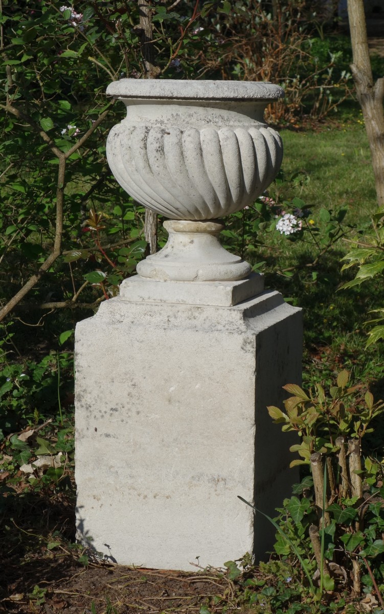 Quatre petits VASES CASSOLETTES sur piédouche en pierre recomposée à côtes torses godronnées.