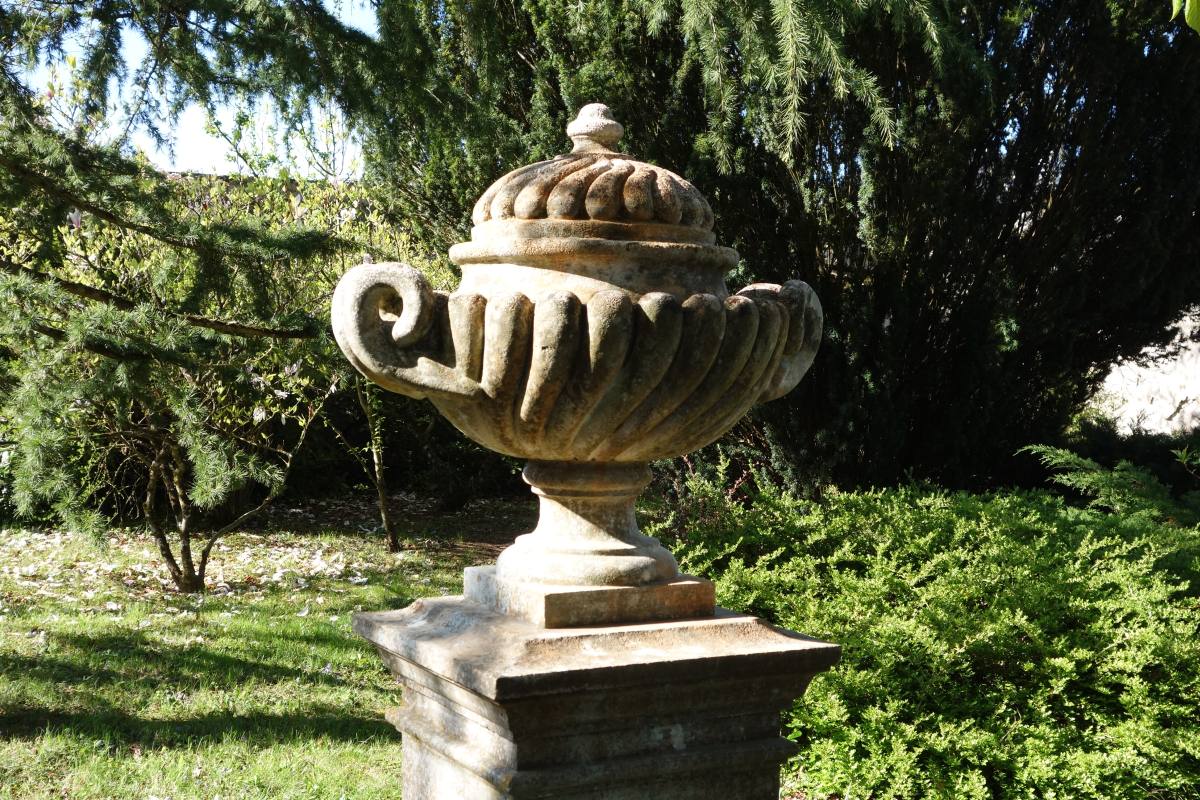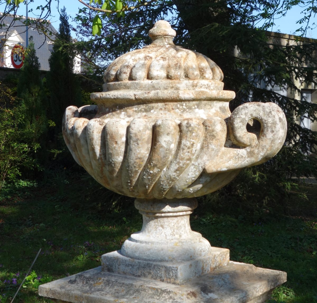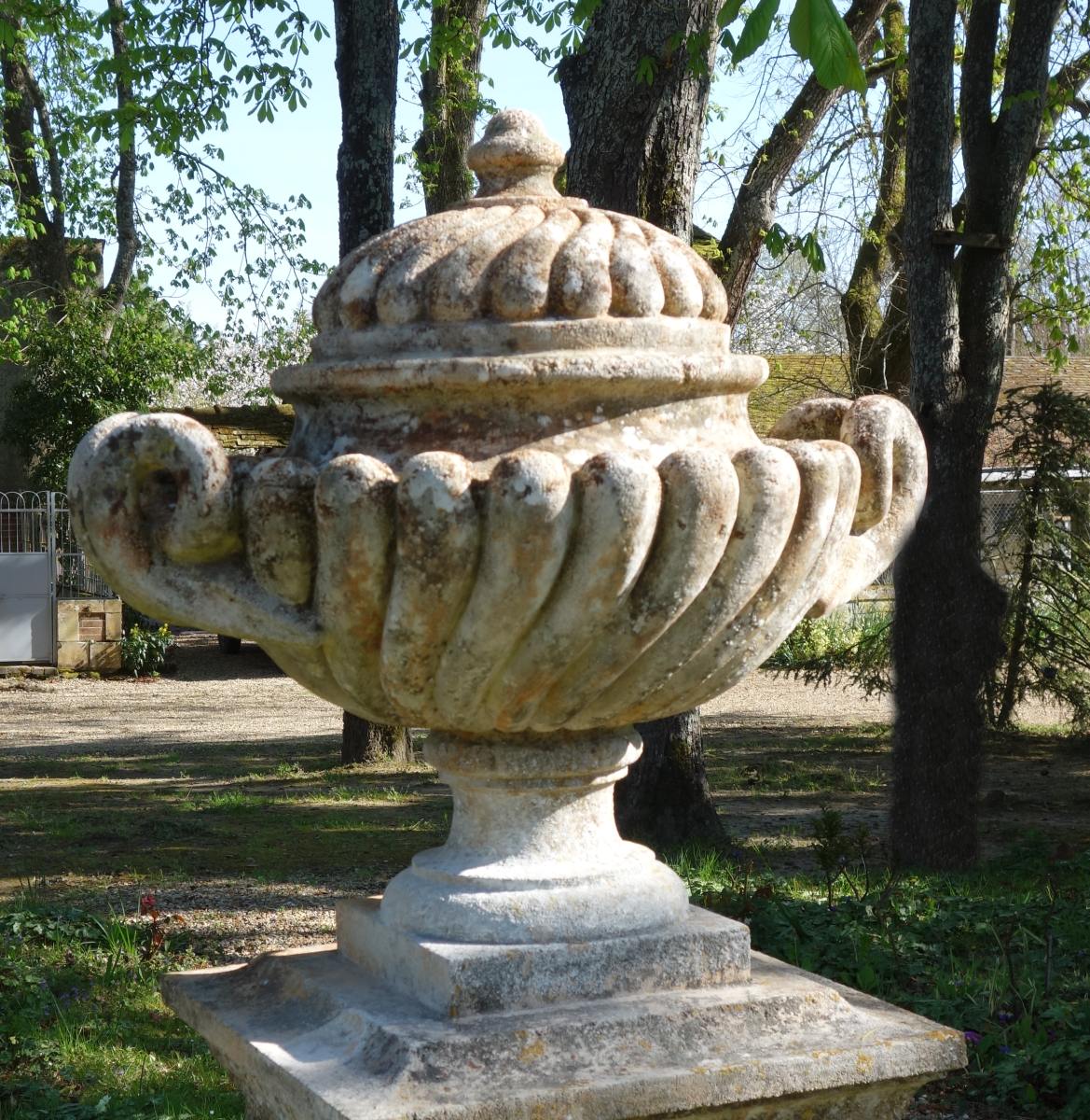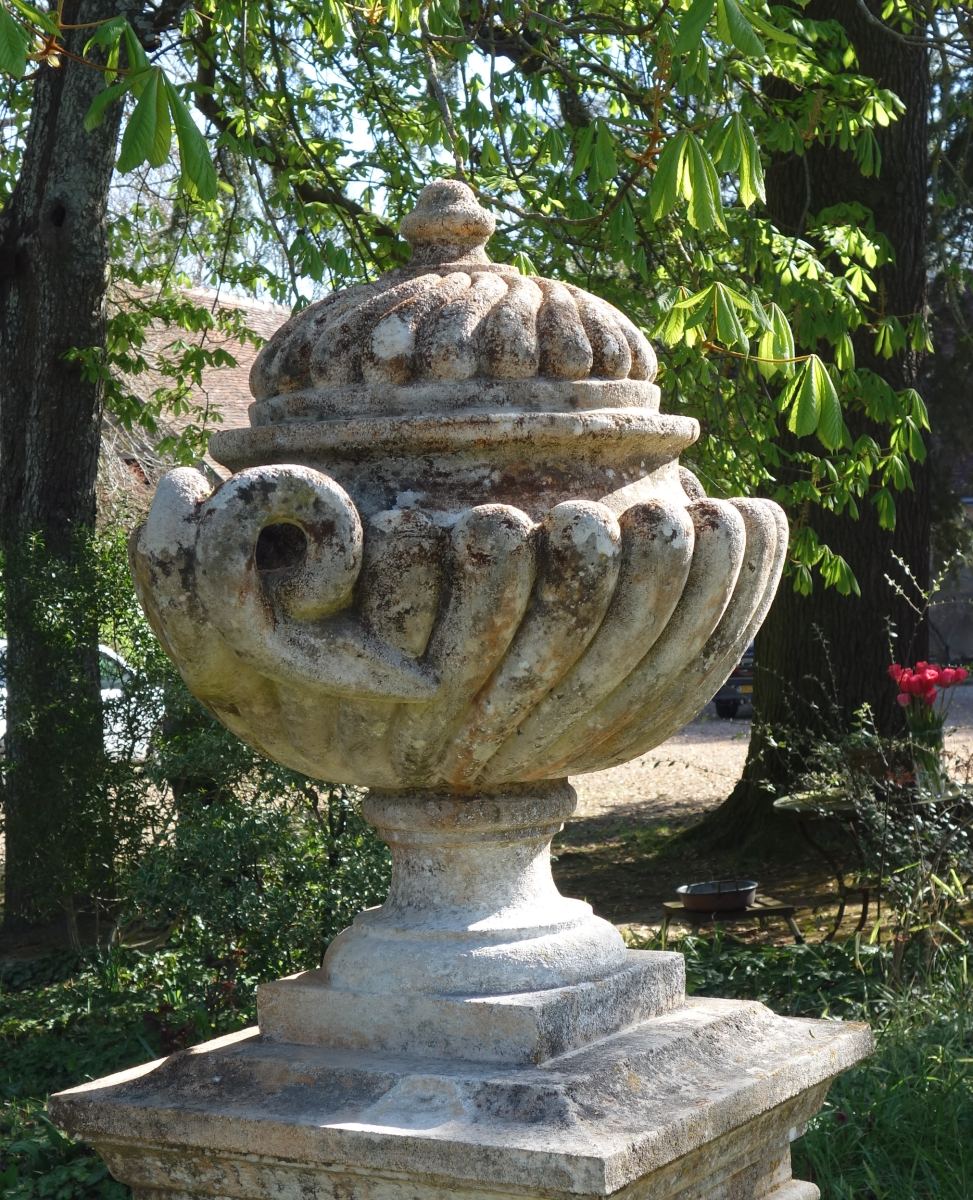 POT À FEU COUVERT à cotes torses godronnées et anses à enroulement en pierre recomposée.
