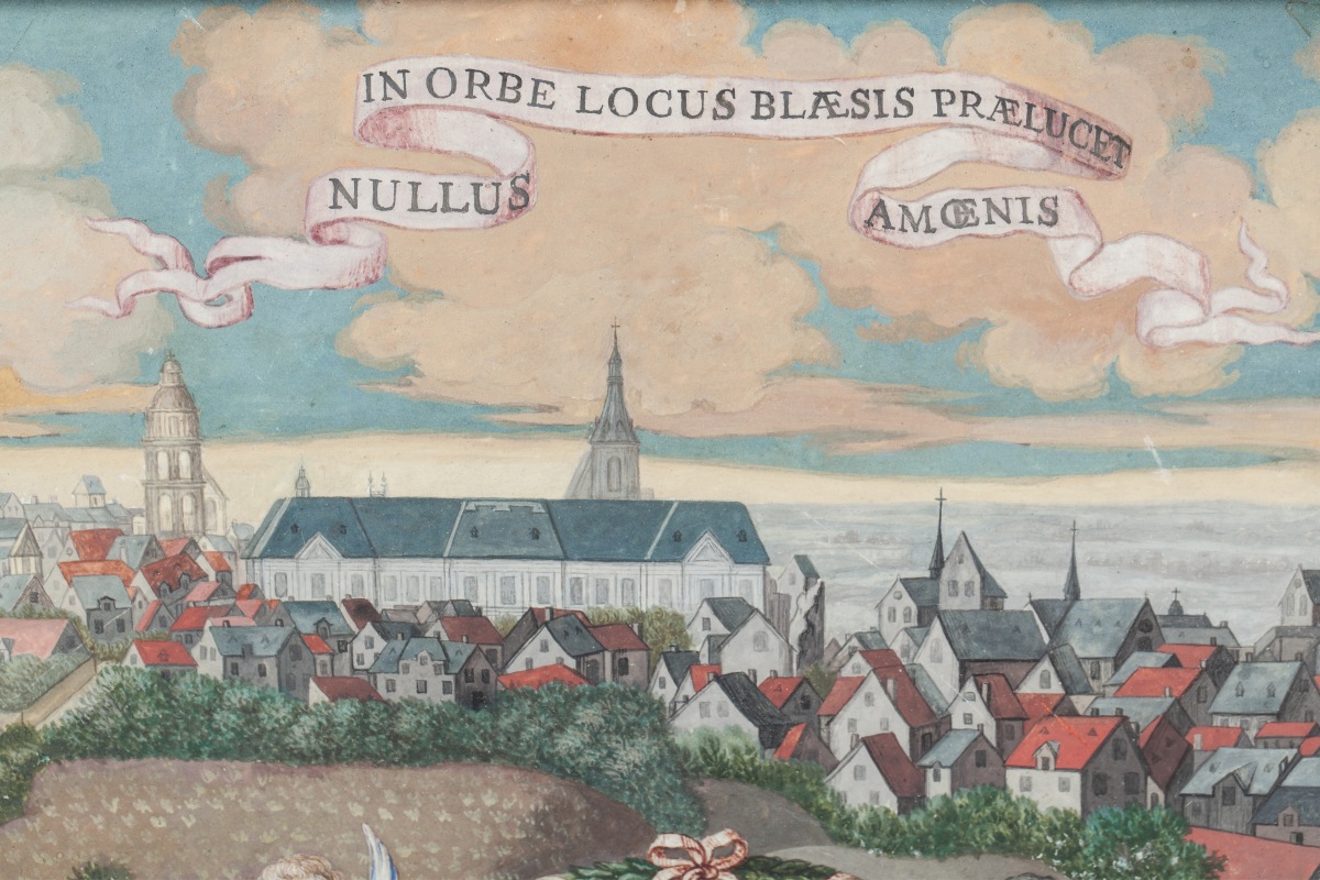 Légendée en haut: " Nullus in orbe locus Blaesis praelucet amoenis ", soit: "Aucun autre lieu dans le monde n'ecclipse le charme de Blois", et en bas au centre " Veue du midi " avec une représentation.