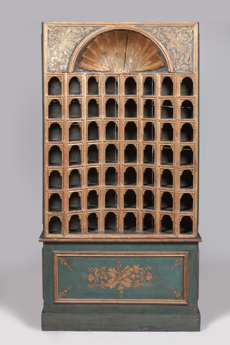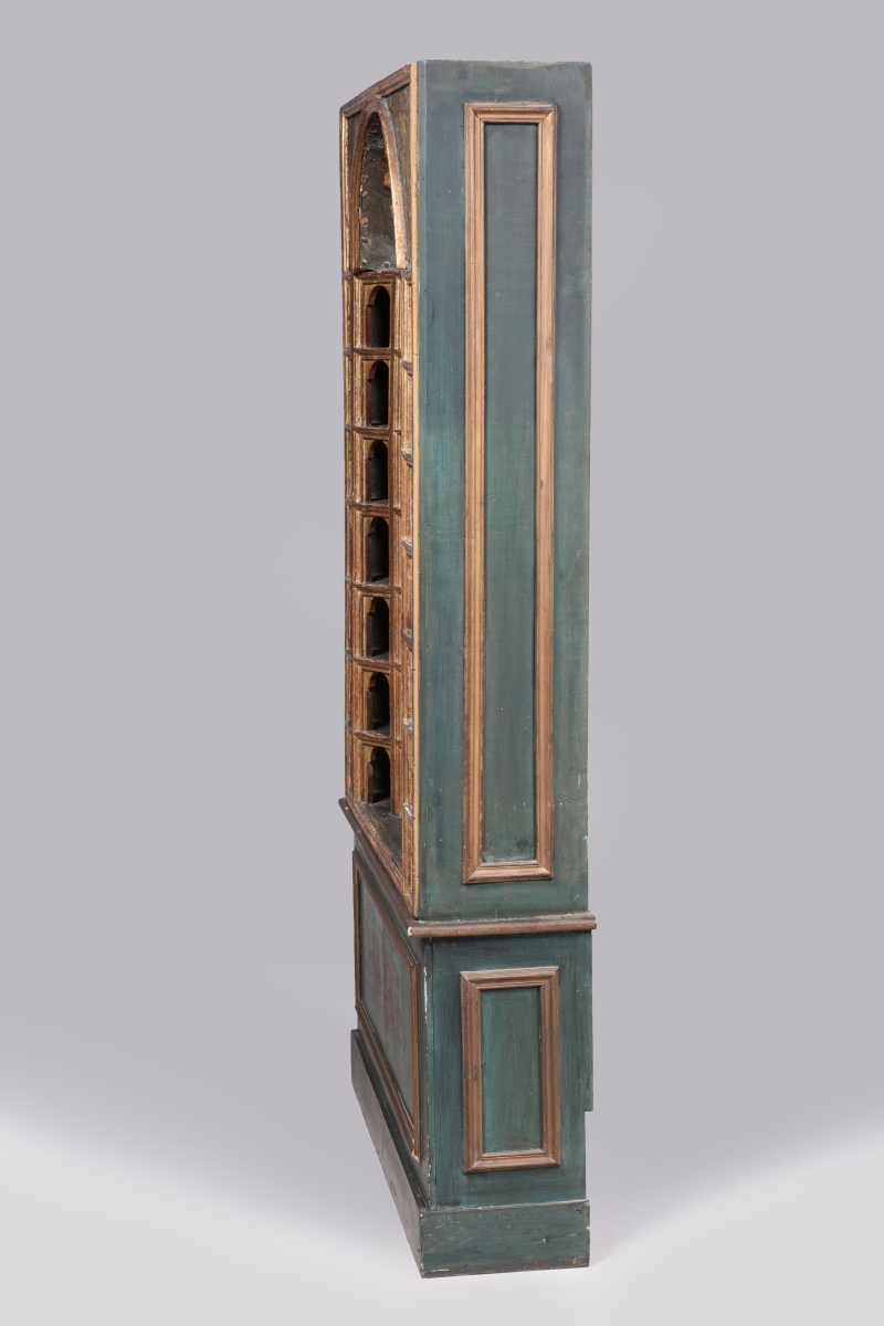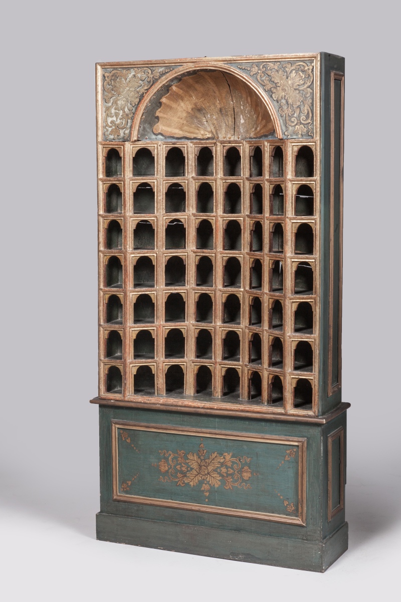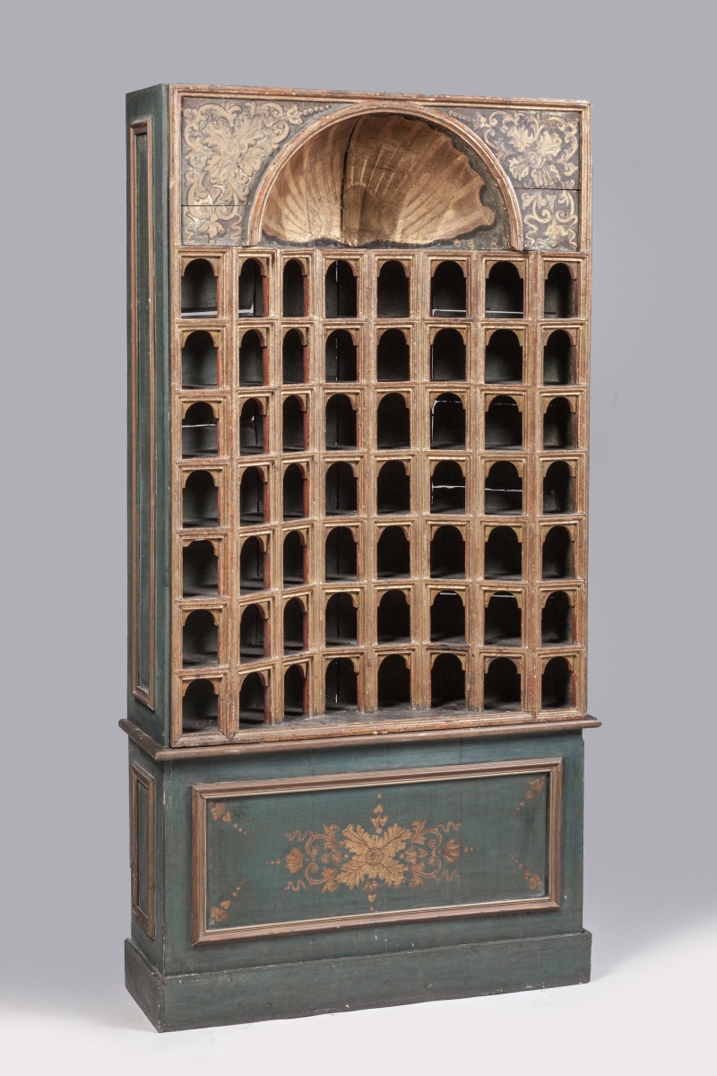 PAIRE D'ARMOIRES dites "DE COLLECTIONNEUR" de forme rectangulaire en bois mouluré, stuqué et doré. La façade en arbalète est munie de 48 niches réparties sur huit rangs. Elles présentent un arc en plein cintre agrémenté d'impostes. Les faces internes des arcs et des pieds droits laqués rouge. Elles sont coiffées d'un quart de sphère concave orné à l'or d'une large coquille et flanqué de deux fleurons à rinceaux feuillagés dorés sur fond laqué bleu-gris.