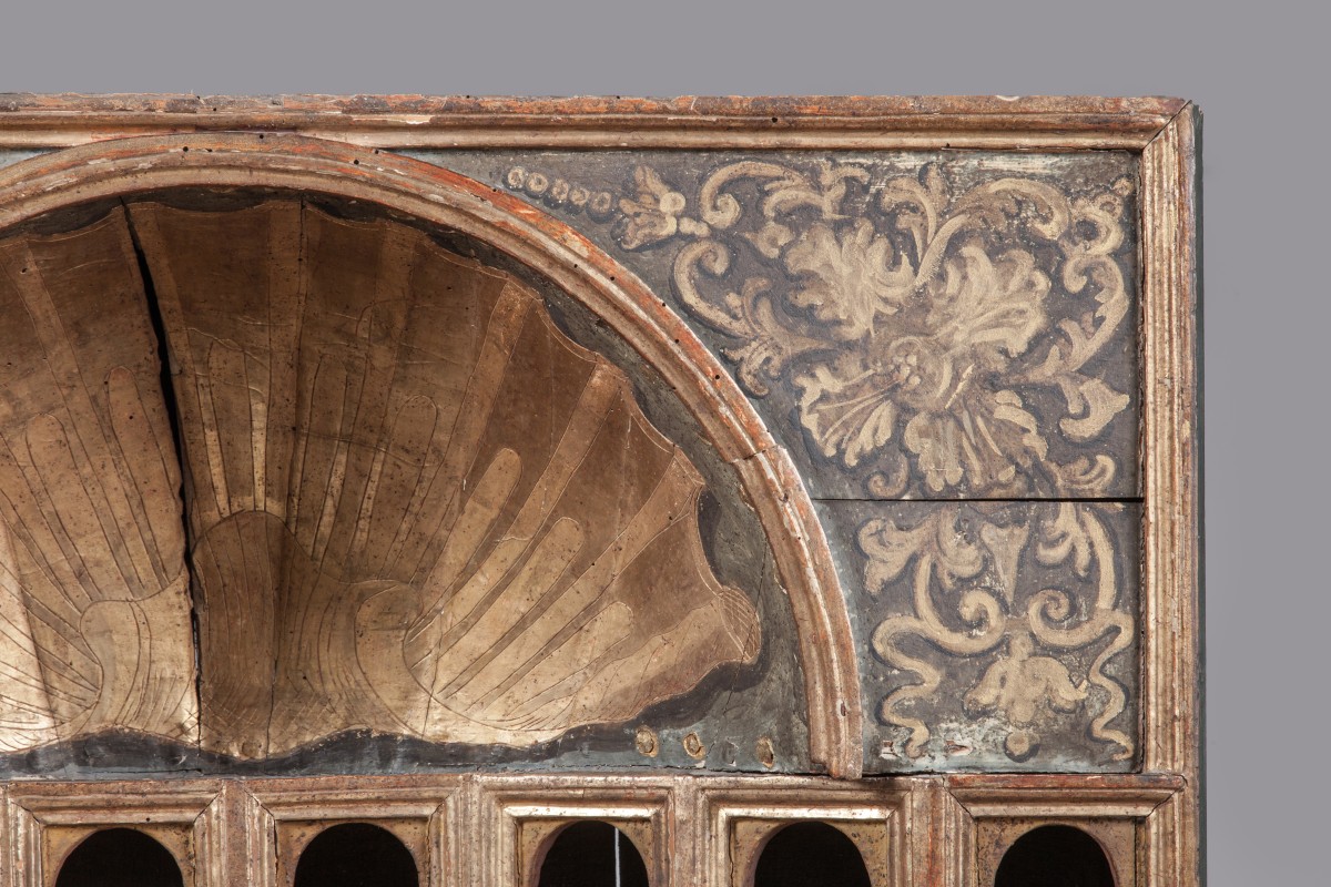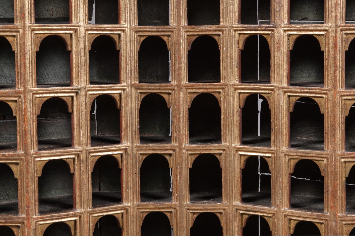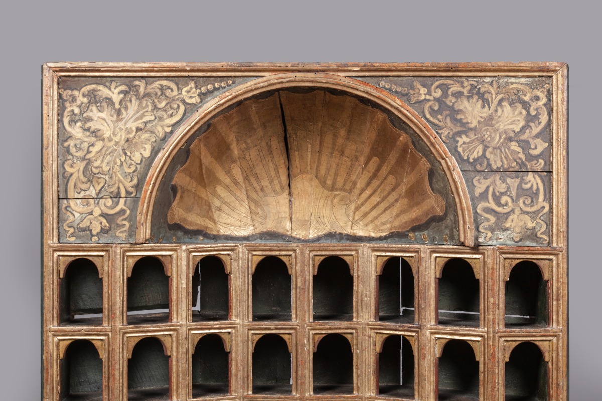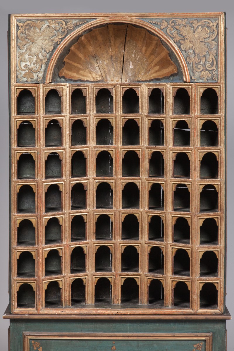 PAIRE D'ARMOIRES dites "DE COLLECTIONNEUR" de forme rectangulaire en bois mouluré, stuqué et doré. La façade en arbalète est munie de 48 niches réparties sur huit rangs. Elles présentent un arc en plein cintre agrémenté d'impostes. Les faces internes des arcs et des pieds droits laqués rouge. Elles sont coiffées d'un quart de sphère concave orné à l'or d'une large coquille et flanqué de deux fleurons à rinceaux feuillagés dorés sur fond laqué bleu-gris.