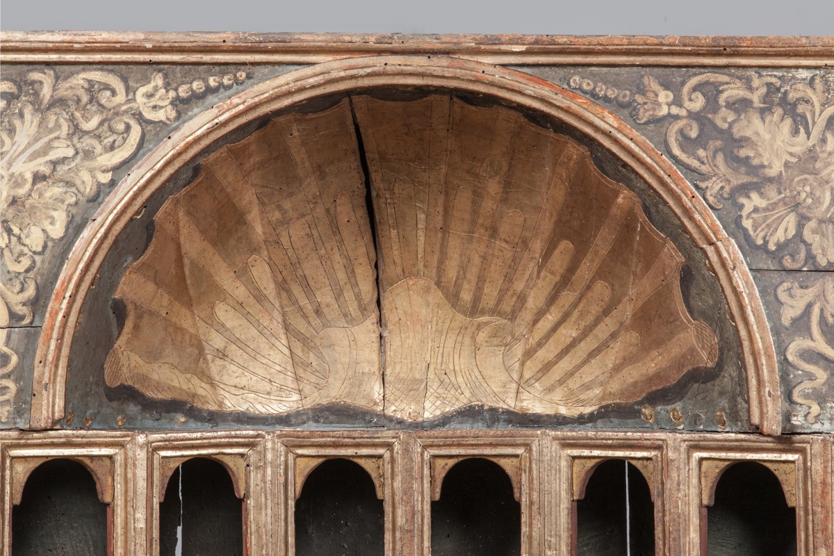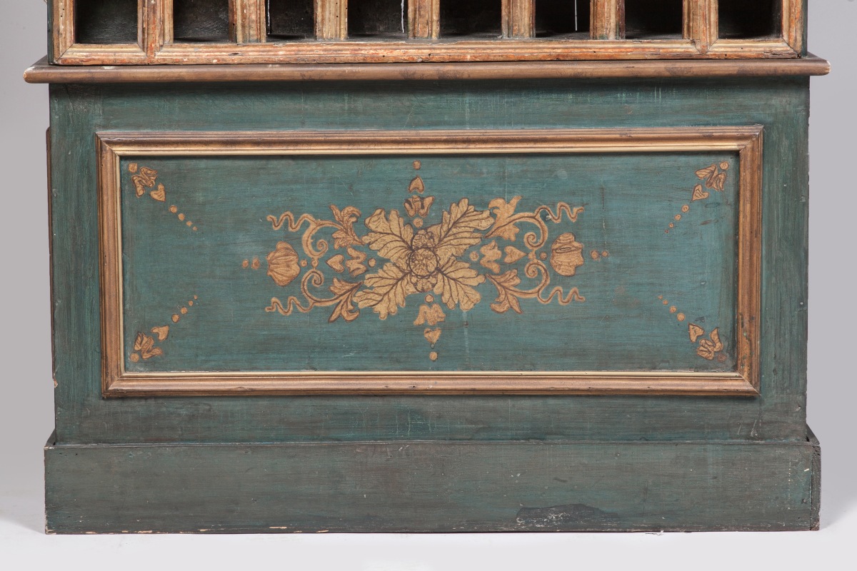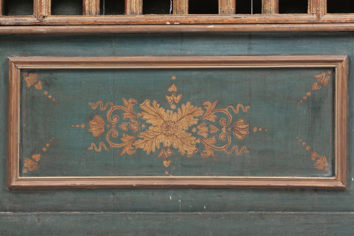 Elles sont agrémentées de panneaux latéraux rechampis bleu canard et or et reposent sur un caisson amovible de mêmes couleurs centré d'un motif feuillagé doré qui s'inspire de celui qui orne la partie supérieure des armoires.