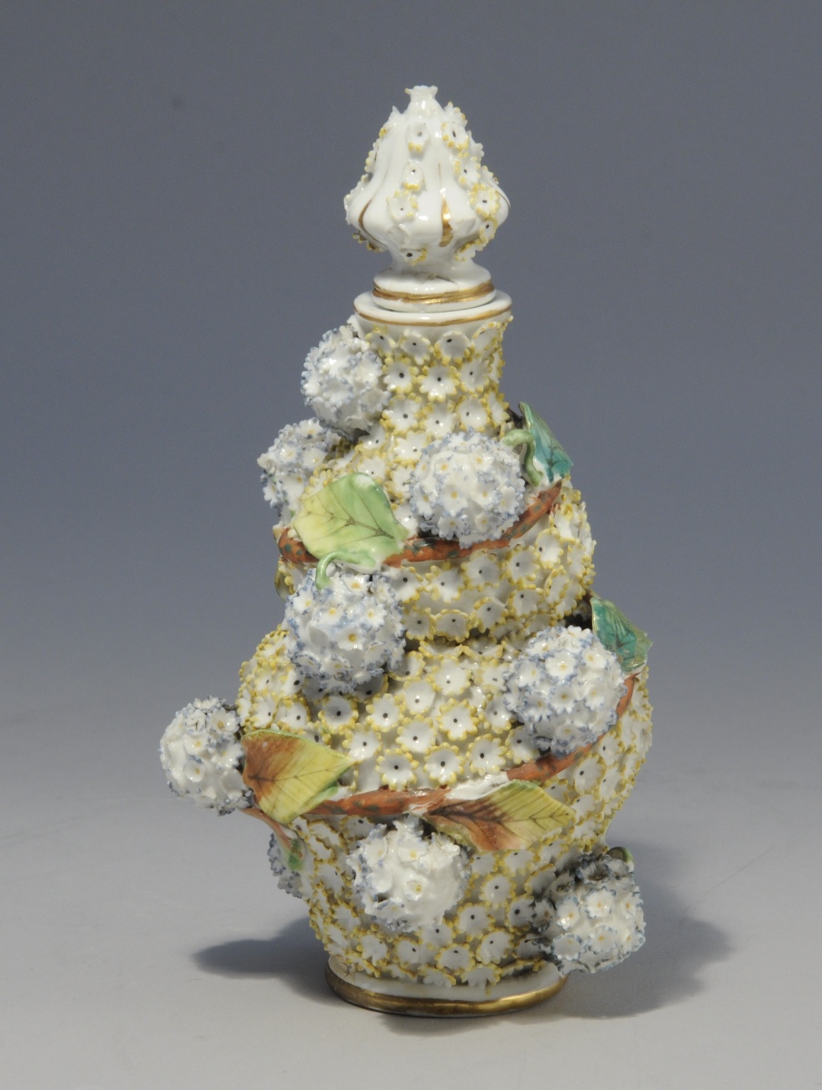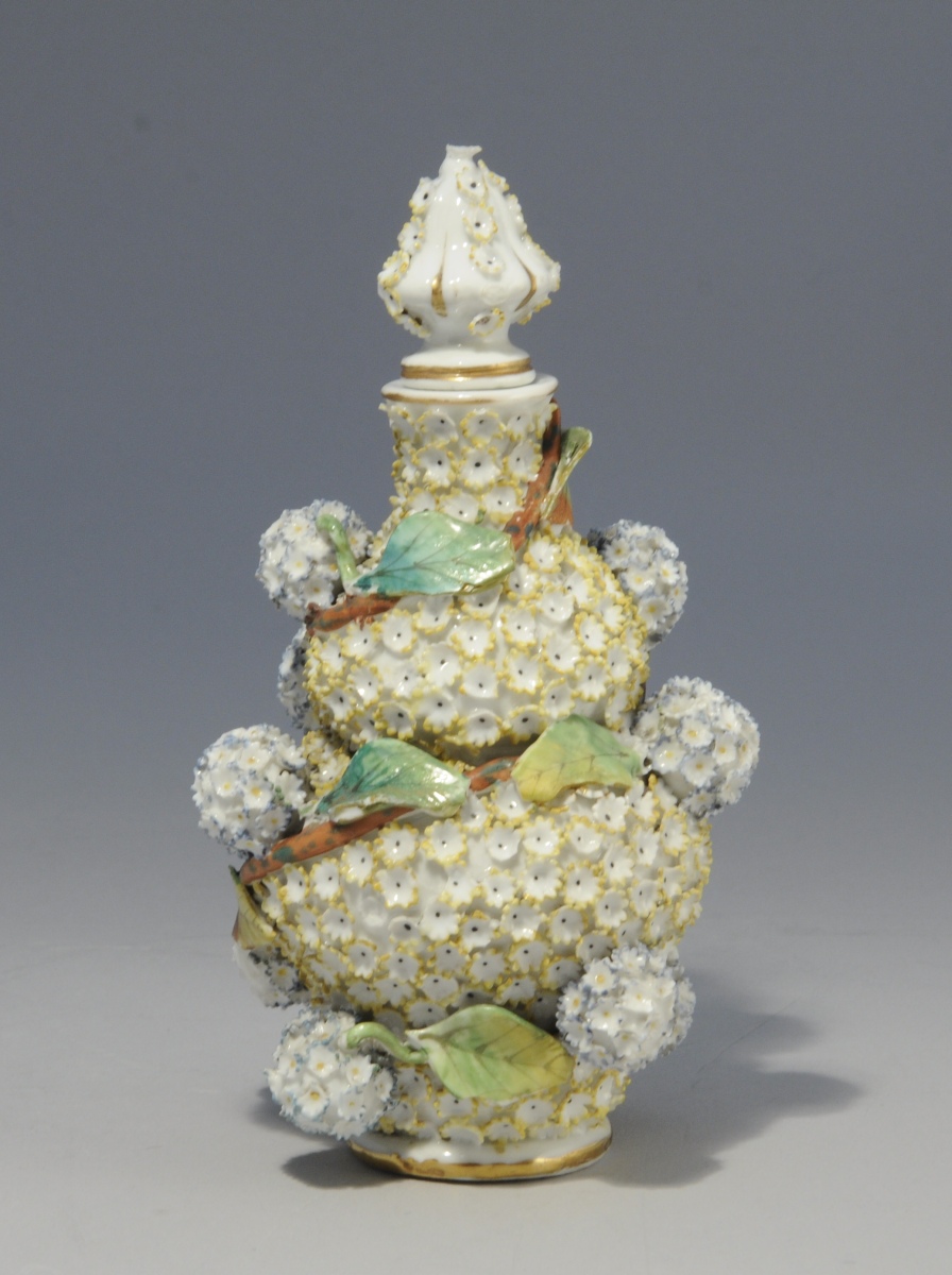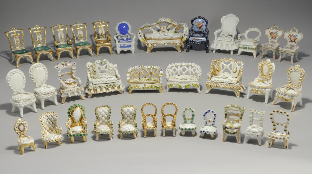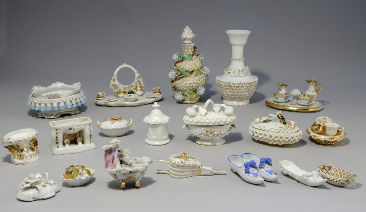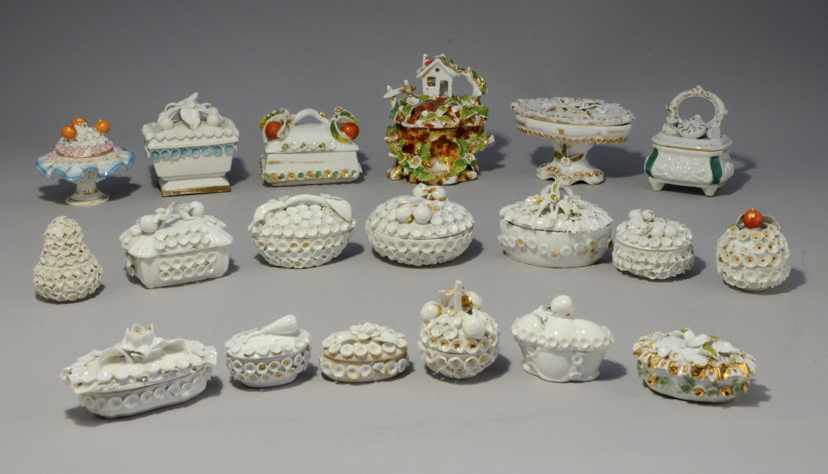 On y joint une collection de plus 100 boîtes, sièges et flacons en porcelaine de France, d'Angleterre et de Saxe. Un grand nombre à décor dit "boule de neige". XIX - XXe siècles. (manques et accidents).