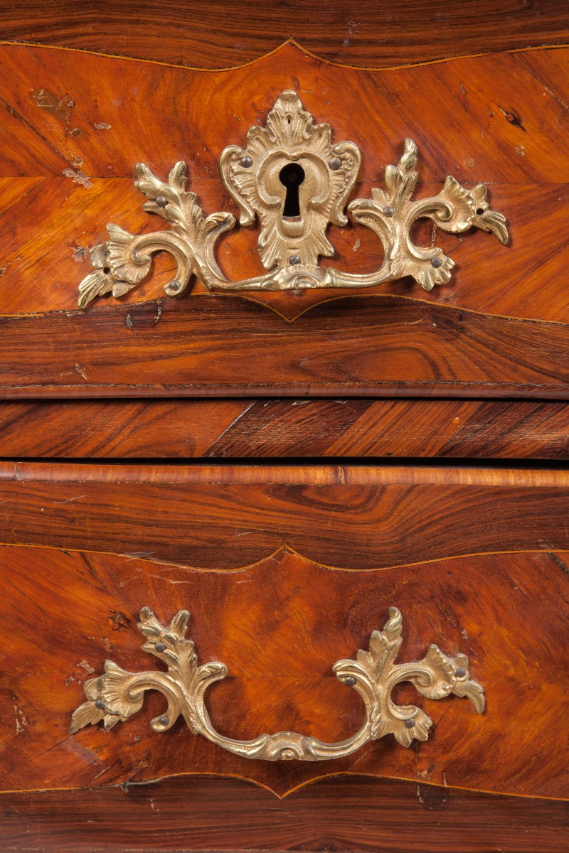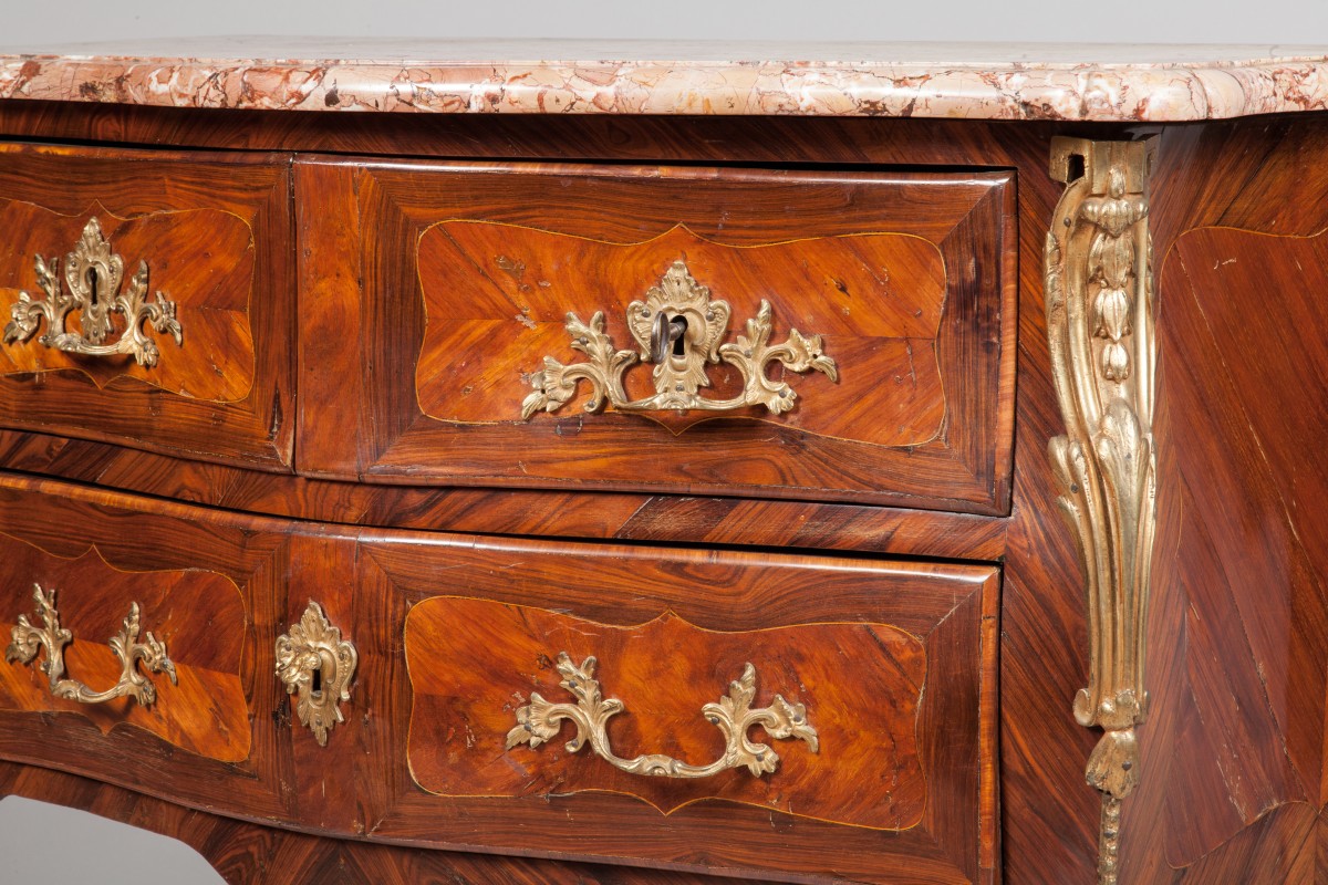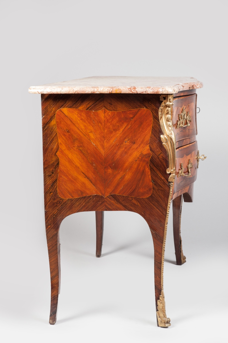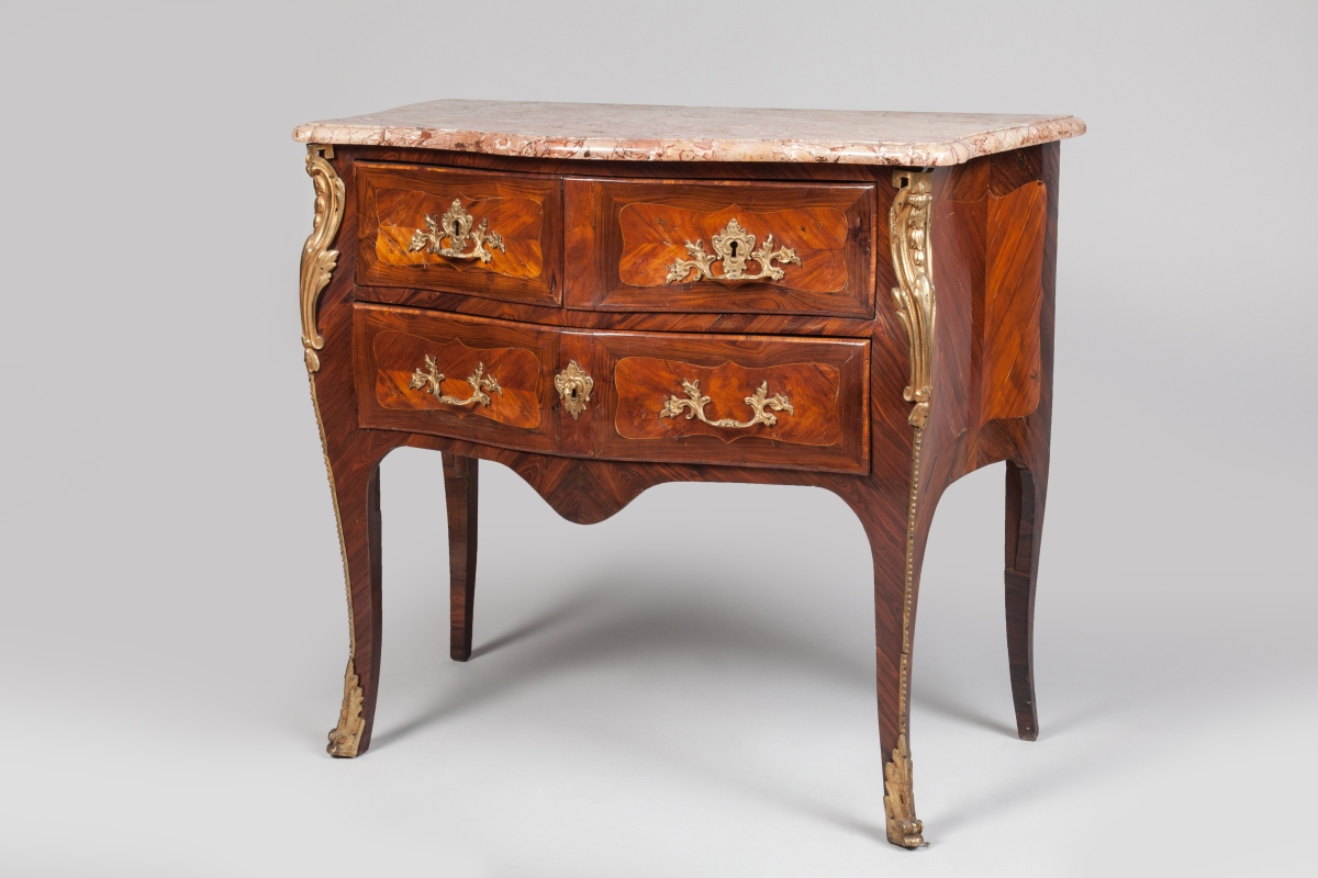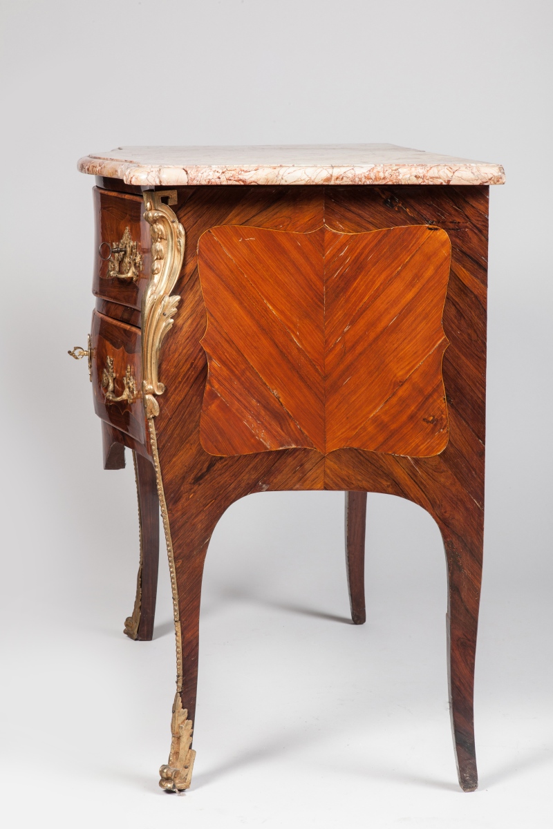 COMMODE galbée à deux rangs de tiroirs, le premier en deux parties, elle est en placage de bois de rose et de palissandre dans des encadrements à filets ; pieds cambrés.