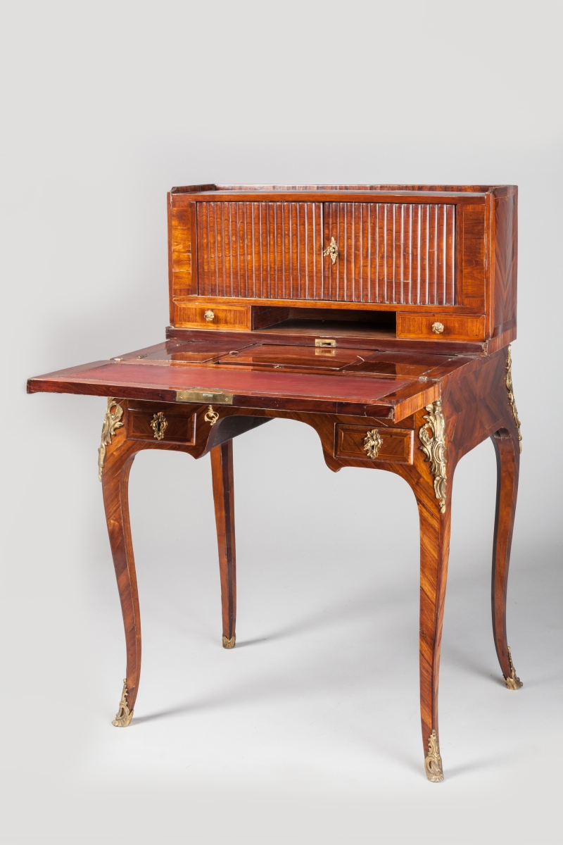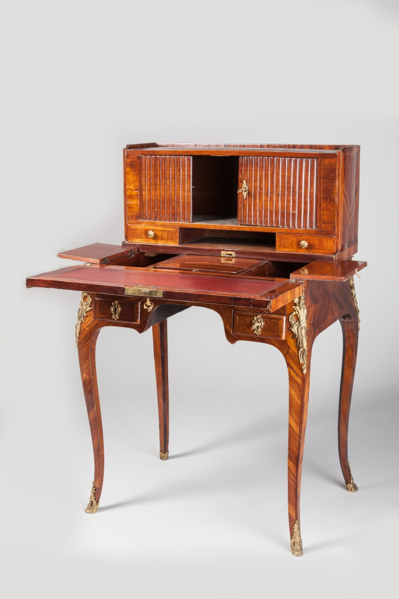 BONHEUR du JOUR en bois de placage et marqueterie toutes faces, en satiné et bois de rose. Il présente un gradin à portes à rideaux coulissants, reposant sur deux tiroirs et une niche. Il ouvre à un abattant dissimulant un plateau coulissant encadré de deux caissons. Deux petits tiroirs en façade. Piètement galbé.