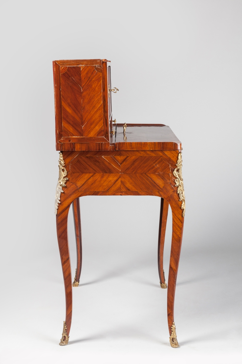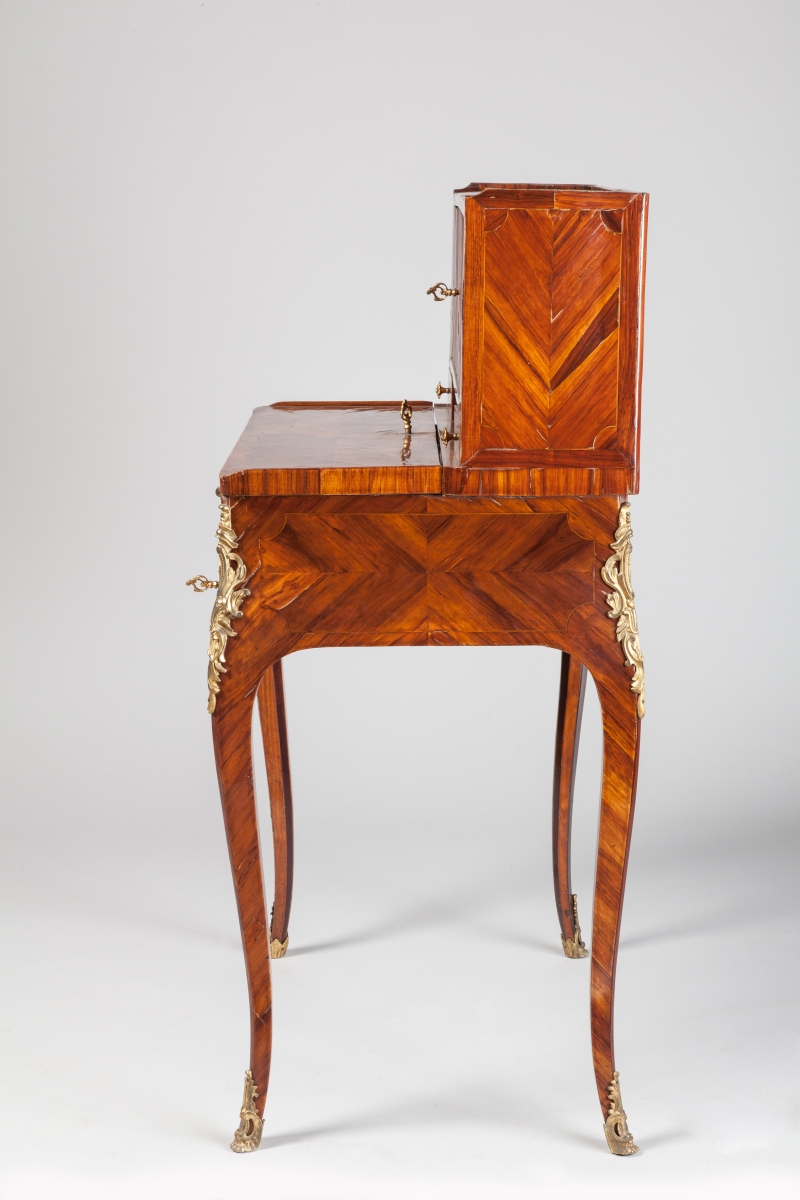 A BONHEUR DU JOUR worked in marquetry. It opens with a flap that dissimulates a plateau. Two small drawers in the front. Louis XV. Ornamented with chiseled and gilded bronzes.