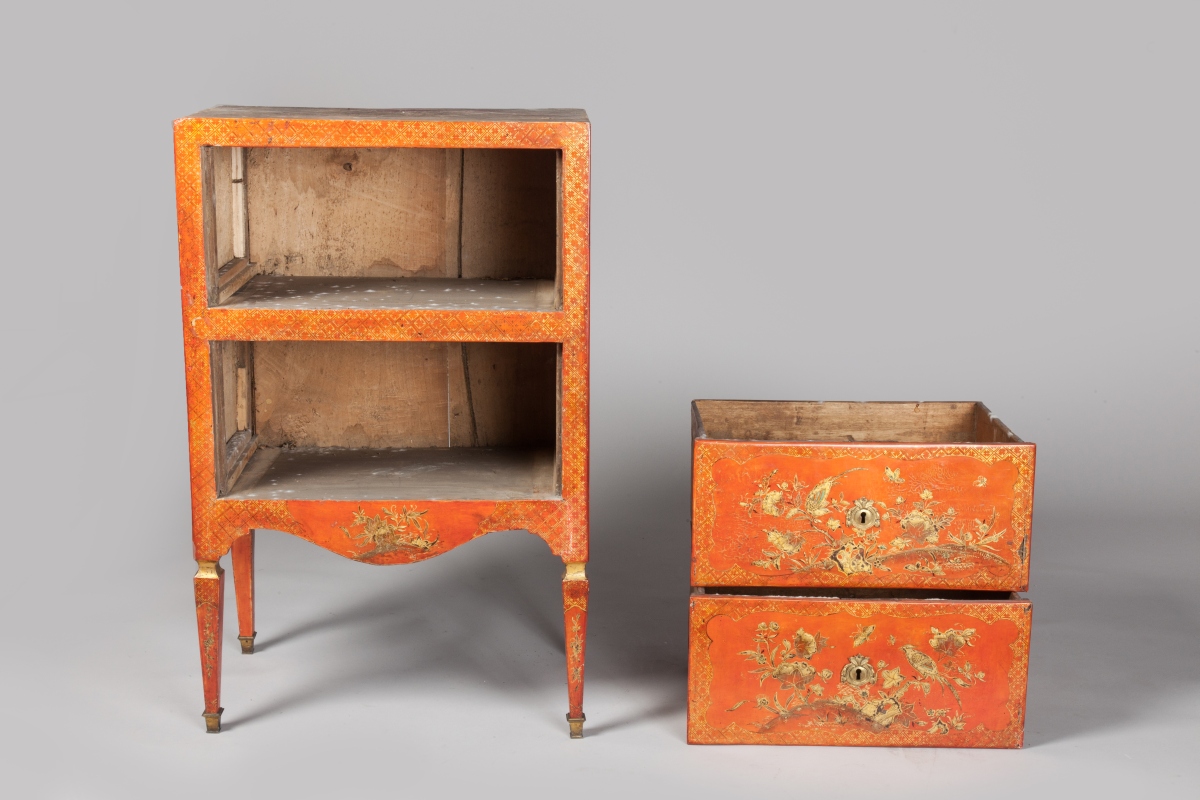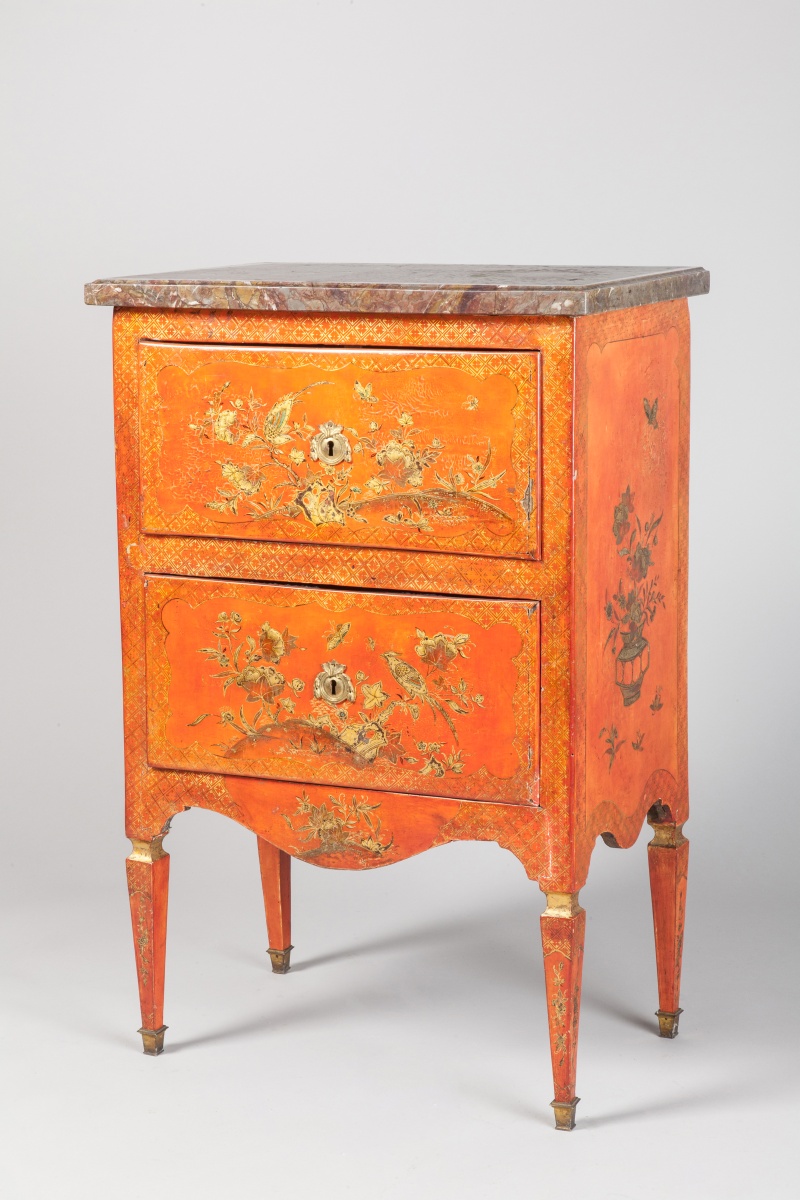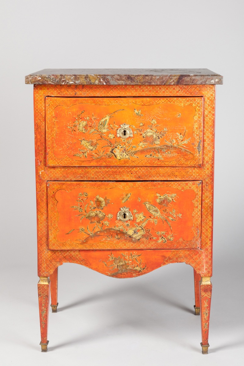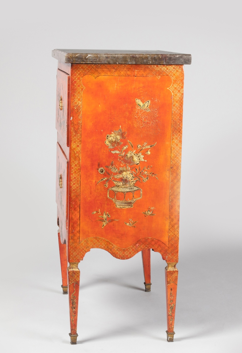 Petite COMMODE en vernis Martin corail, à décor de fleurs, de papillons et d'oiseaux exotiques. Elle ouvre par deux tiroirs et repose sur des pieds gaines resserrés au sommet.