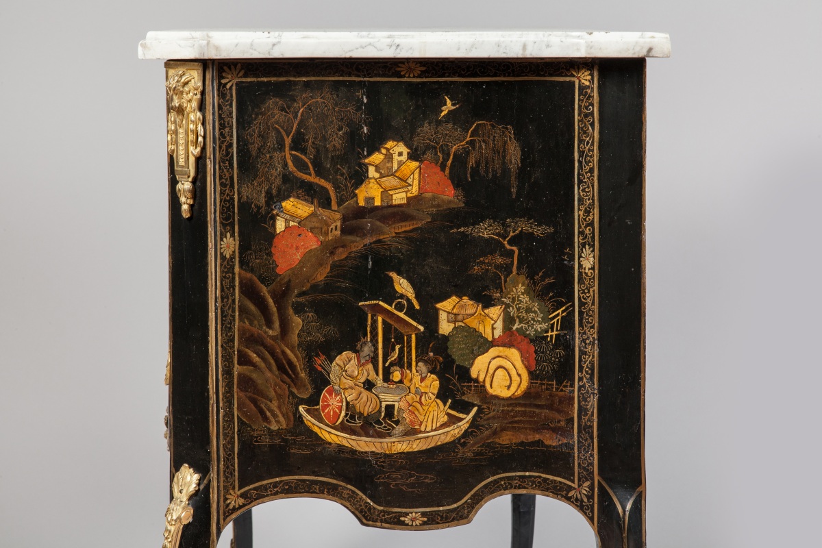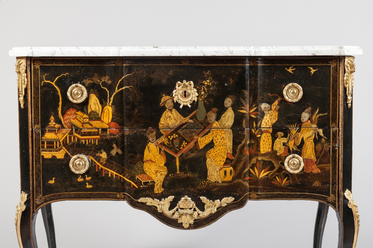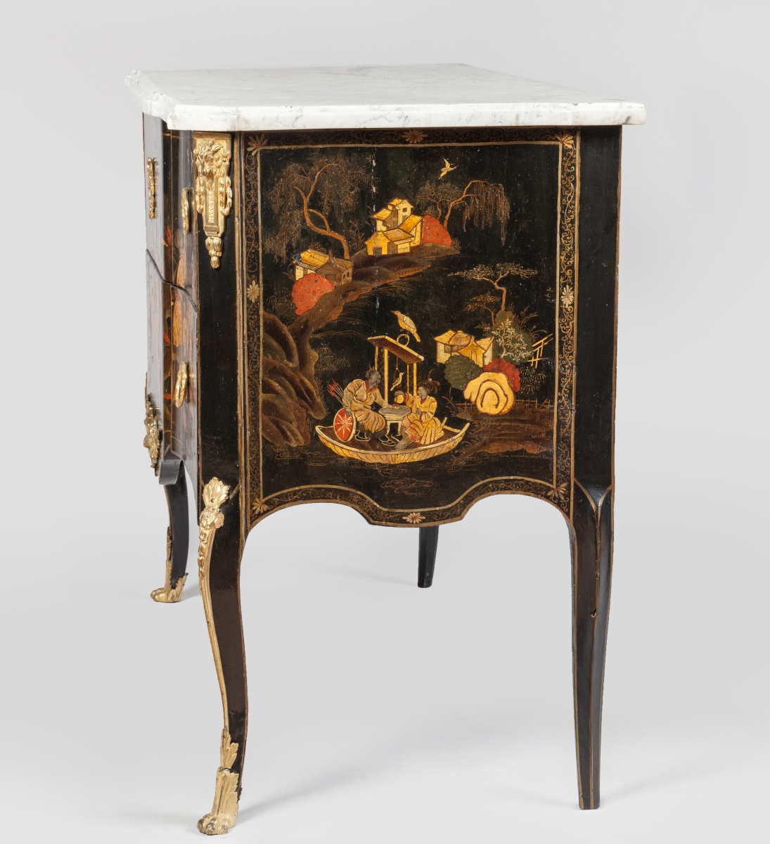 COMMODE dite en "VERNIS MARTIN" à léger ressaut ouvrant par deux tiroirs sans traverse à décor de chinoiseries en vernis or sur fond noir en façade et sur les côtés. Le côté gauche est consacré à une scène de pêche, alors que le droit montre une collation entre chasseurs sur une barque. En façade, une scène centrale figure l'empereur de Chine, attablé avec trois autres personnages, avec à gauche une scène de palais lacustre et à droite une chasse au canard dans les marais. Elle repose sur quatre pieds cambrés.