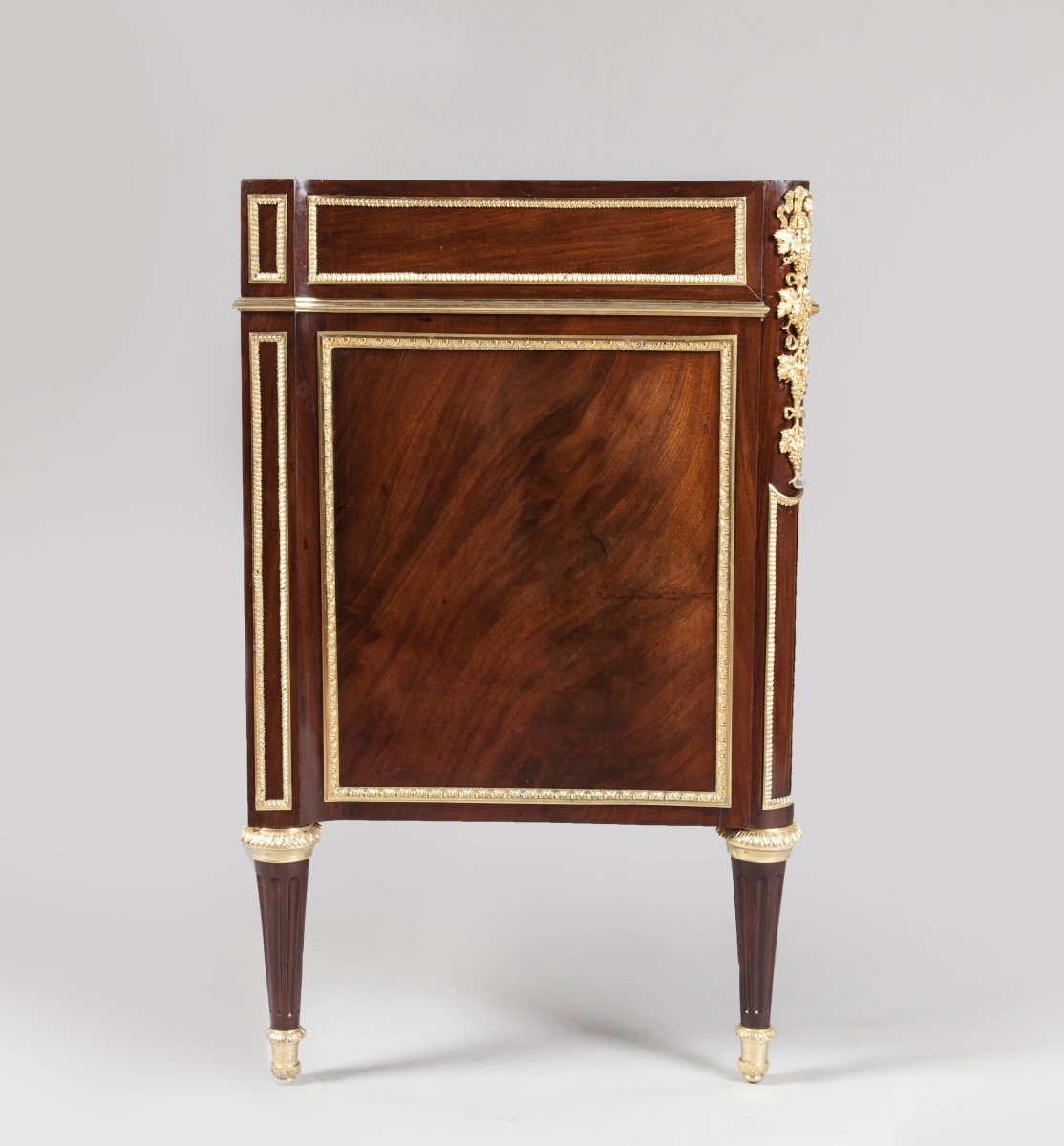 Notre commode témoigne du changement du goût apparu dans les années 1765-1770. Elle peut être datée des années 1785 par son architecture: léger ressaut central, les montants arrondis et défoncés. Elle illustre parfaitement la simplicité du décor qui privilégie la ligne où l'acajou à ramages prend tout son éclat et abandonne le "tableaux de marqueterie" cher à Oeben.