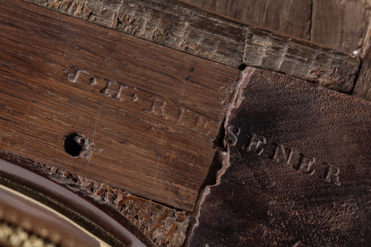 Jean-Henri Riesener (1734-1806) est un ébéniste d'origine allemande, formé dans l'atelier de Jean-François Oeben. Reçu maître le 23 janvier 1768, il reçoit le titre d'ébéniste ordinaire du mobilier de la Couronne, en remplacement de Joubert. Durant plus de dix ans, il est le plus grand et le plus célèbre fournisseur des hauts personnages de la Cour et des demeures des membres de la famille royale, pour qui il produit environ 700 meubles. Sur cette commode nous retrouvons les qualités esthétiques, la sobriété des lignes, le raffinement de la construction et la magnificence des bronzes, caractéristiques des ouvrages de Riesener.