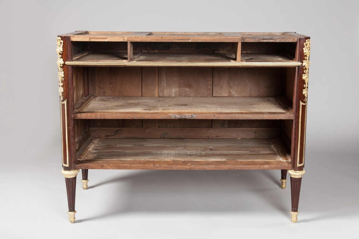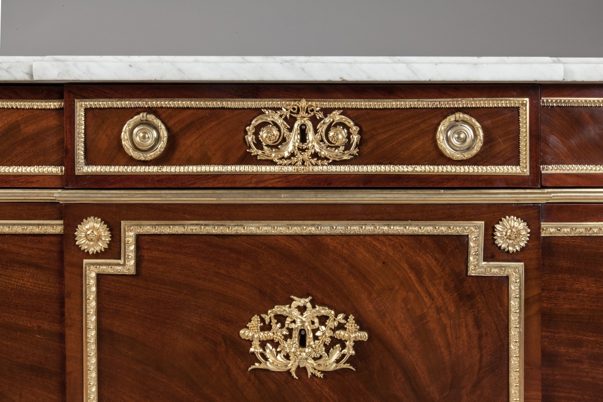 Cette répartition tripartite de la façade se retrouve sur: la commode livrée en 1783 pour le salon des jeux de Louis XVI à Fontainebleau (conservée au Institute of Arts à Chicago) ou celle livrée pour la chambre de Marie Antoinette aux Tuileries en 1784 (conservée au Musée du Louvre à Paris) ; sans oublier le rapprochement avec les commodes présentées au Salon des Nobles de la Reine à Versailles en 1786, et à celui de ce même Salon des Nobles de Saint Cloud en 1788.