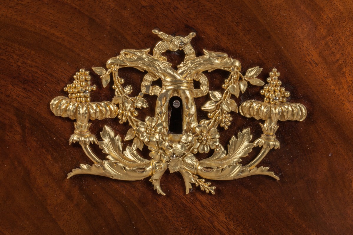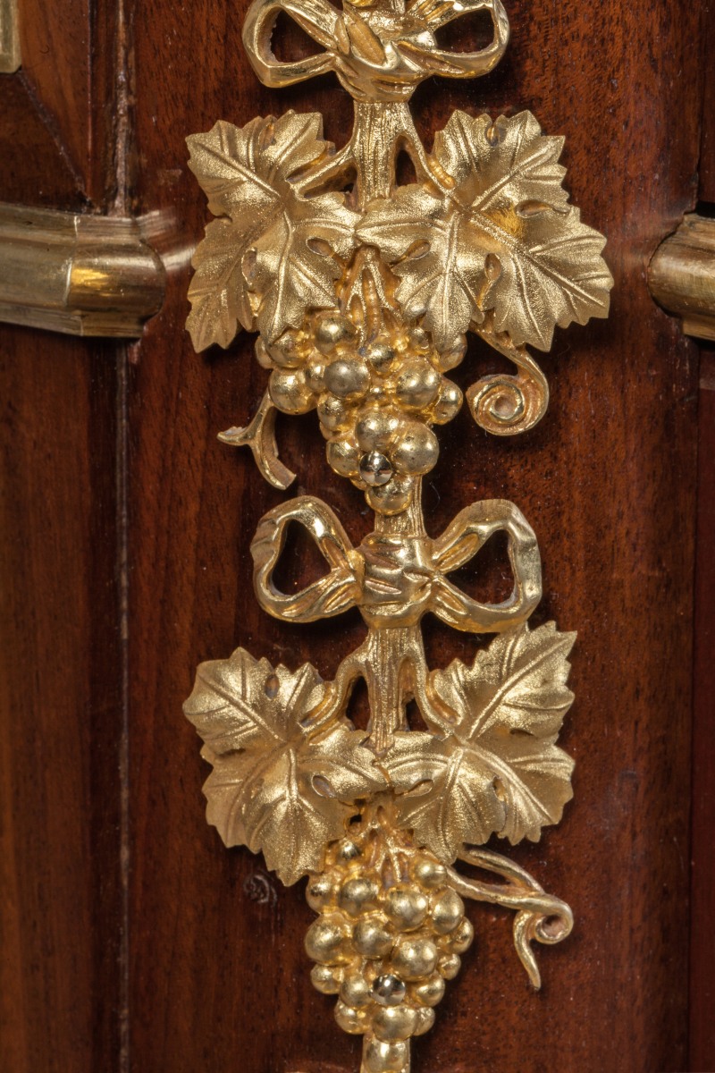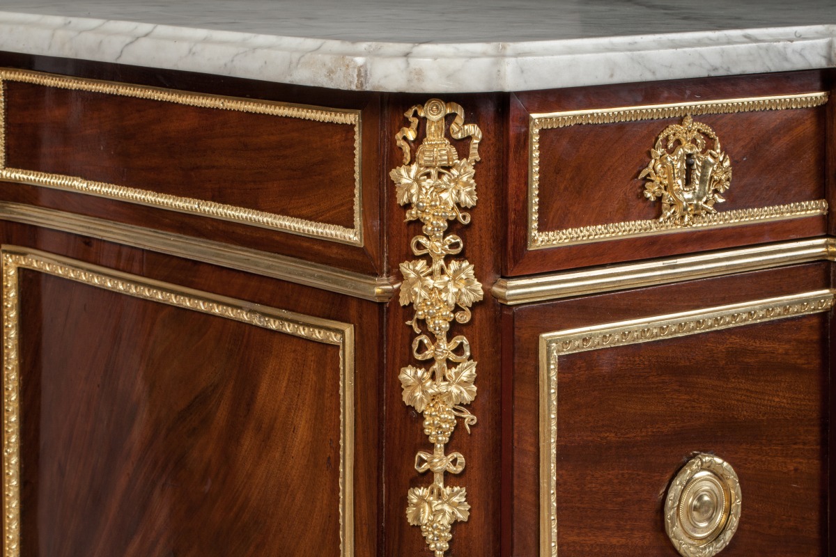 On retrouve cette luxuriance des bronzes dans les réalisations de François Rémond et Pierre Gouthière. Le haut des pilastres est orné de délicates chutes en bronze: un enrubanné de guirlandes à décor alterné de grappes de raisin et de feuilles de vigne finement ciselées, et doré à l'or moulu. Notons que l'on retrouve le même cul-de-lampe de notre commode à décor de canaux, feuilles d'acanthe et pigne de pin - sur les commodes Riesener exposées: à la Frick collection à New York (Figure 1), au Musée Jacquemart-André à Paris (Figure 2), et à Versailles, au Petit Trianon sur la commode dans l'ancien billard, ou petite salle à manger du grand étage (Figure 3).