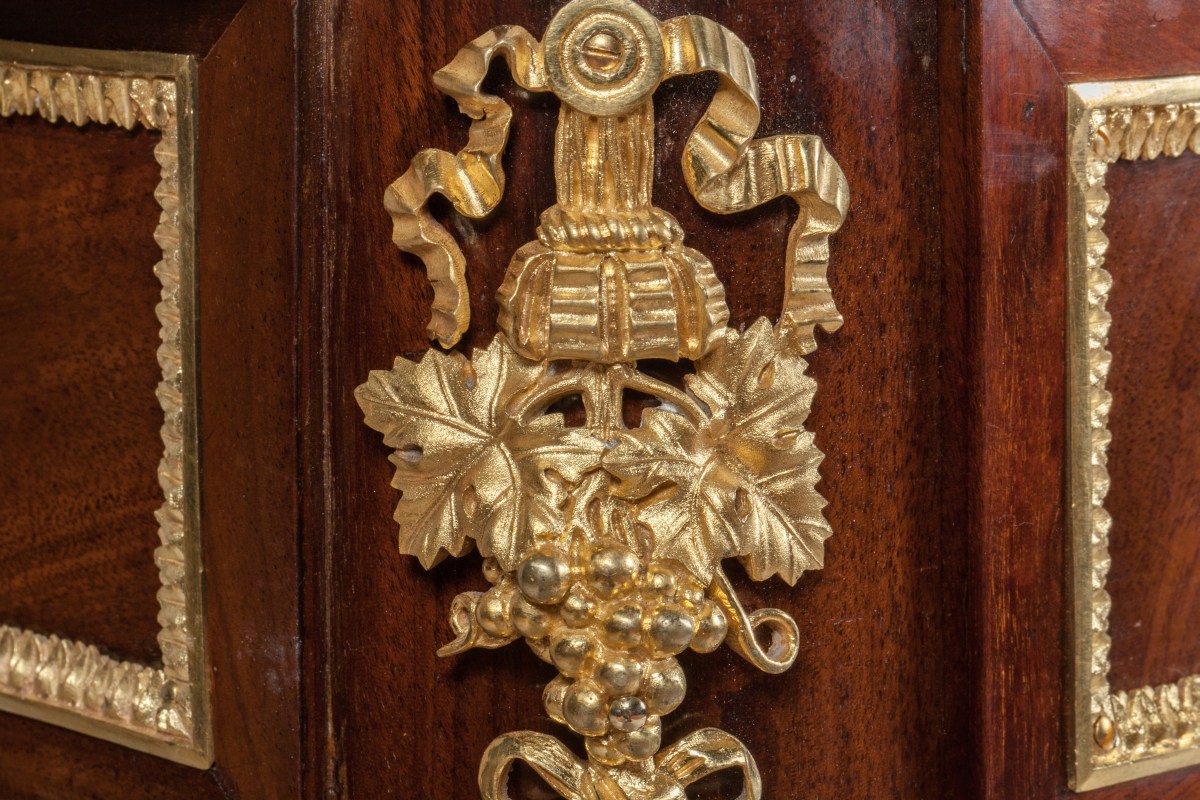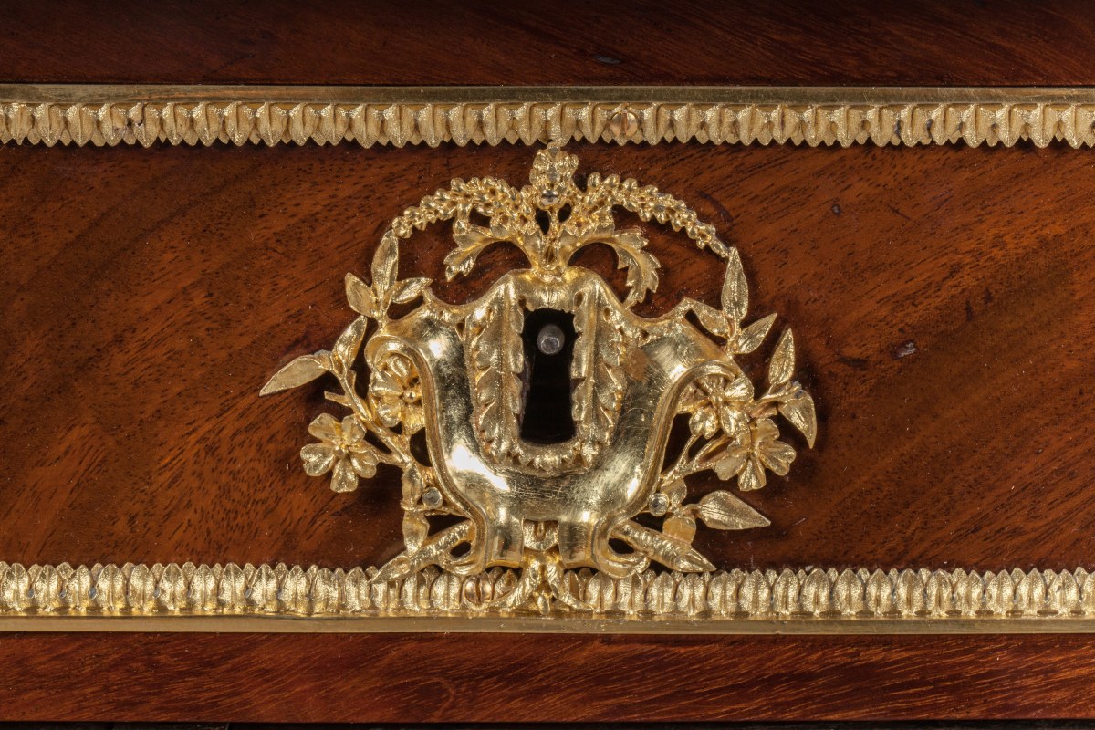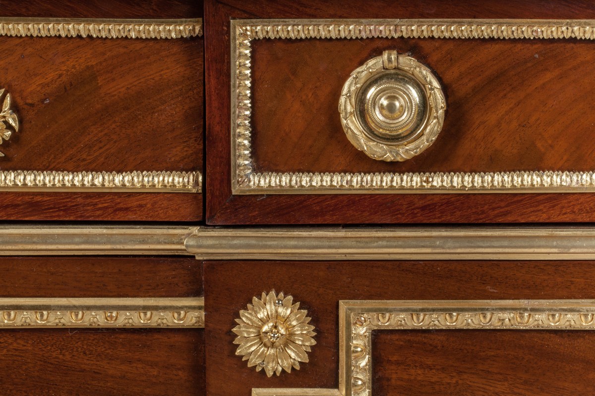 Superbe COMMODE à léger ressaut central en acajou et placage d'acajou. Elle présente deux larges tiroirs sans traverse, surmontés d'un rang de trois petits tiroirs. Montants antérieurs et postérieurs légèrement arrondis, reposant sur quatre pieds fuselés et cannelés. Riche ornementation de bronzes ciselés et dorés: encadrements, baguettes moulurées de godrons et feuilles d'eau, poignées à anneaux et pastilles à tore de laurier, entrées de serrure à double tête d'aigle aux feuilles d'acanthe et grappes. Les chutes d'angle à guirlandes et pampres. Sabots et anneaux ouvragés de feuilles d'eau. Le tablier en cul de lampe à feuille d'acanthe et pomme de pin.