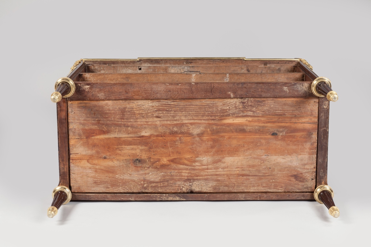 Enfin on note dans la soumission de Riesener en 1786, des commodes similaires dont une de quatre pieds de long qui pourrait correspondre à la typologie de celle que nous présentons. (Arch. nat. 01 3640)
