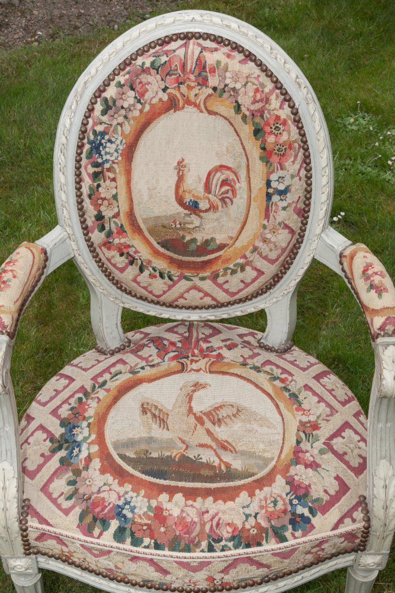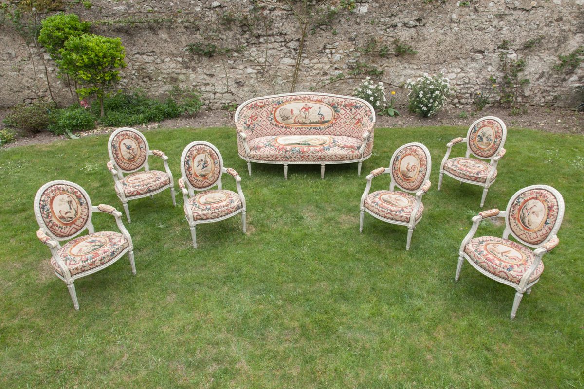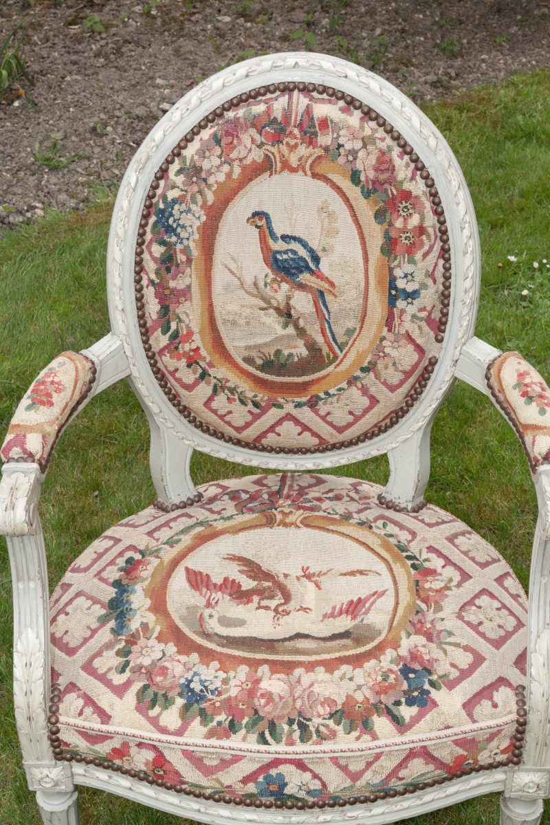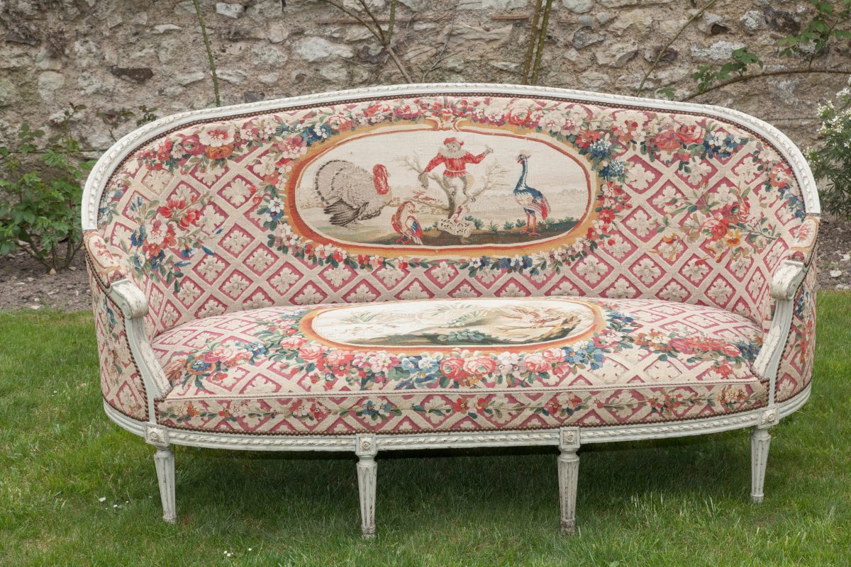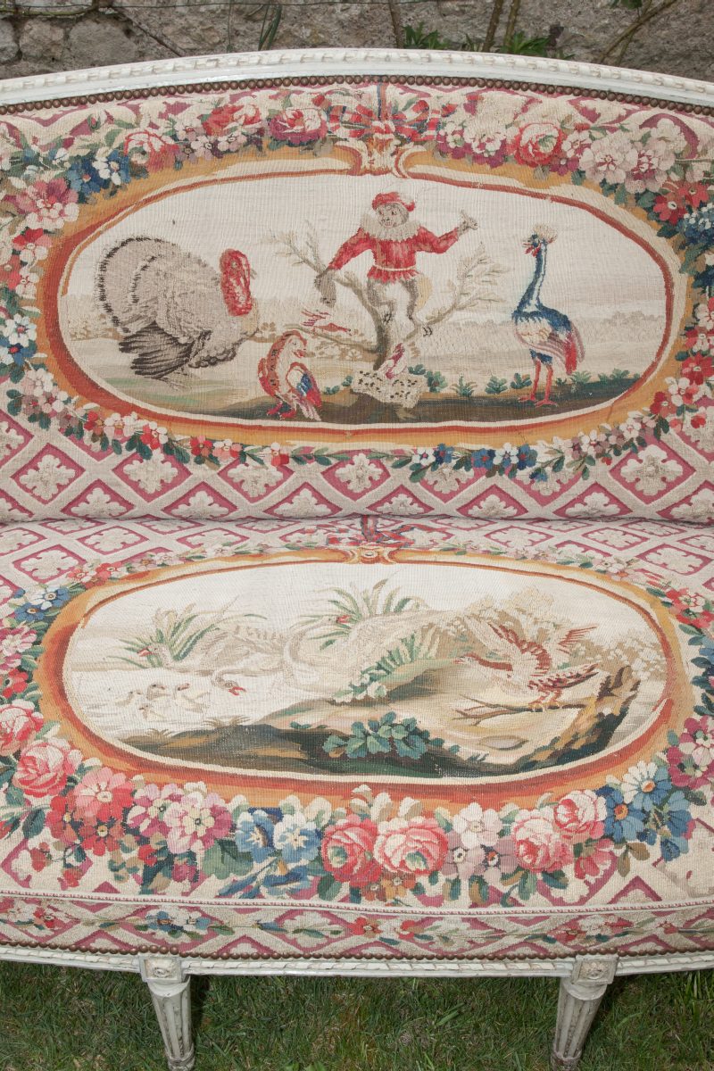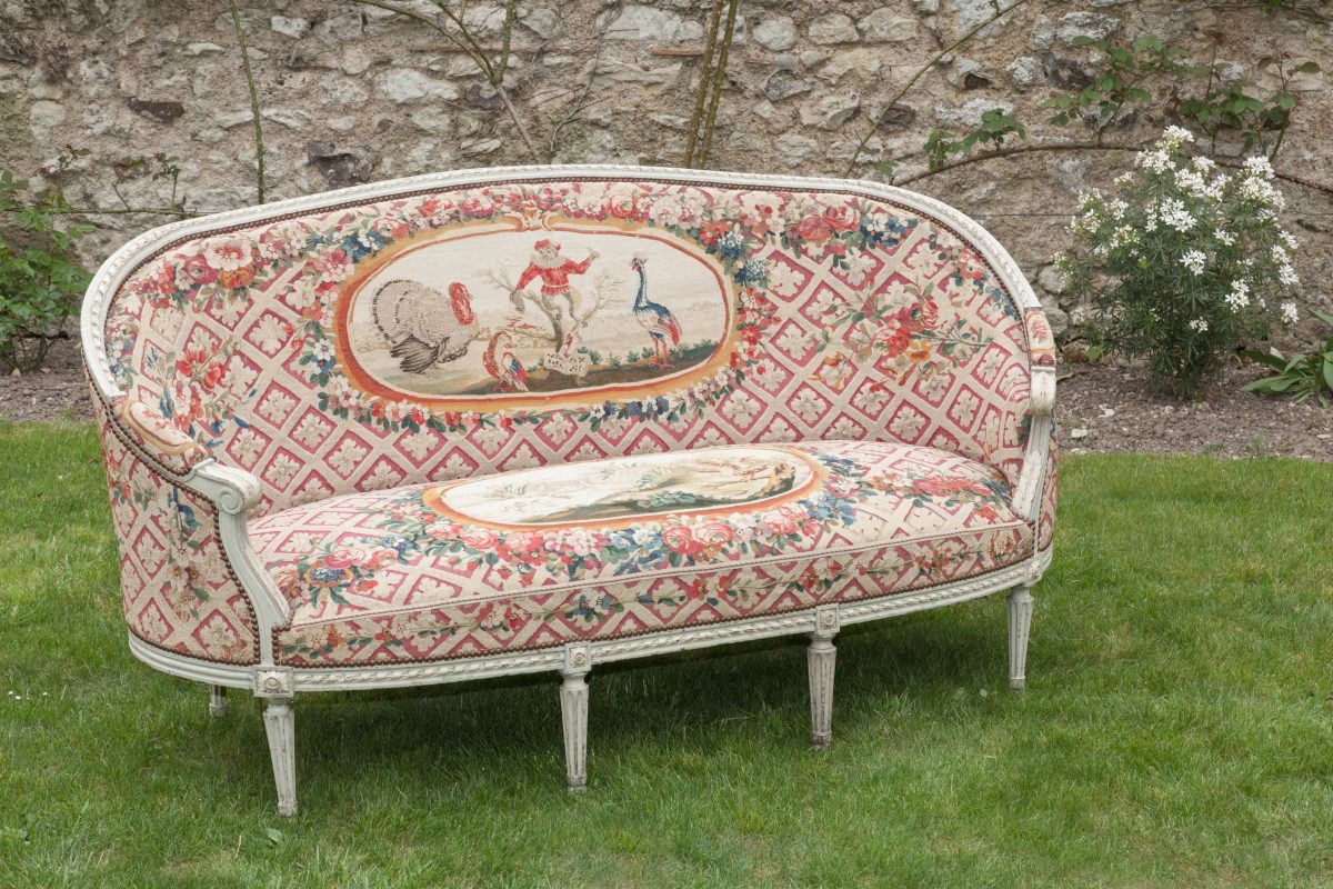 Six ARMCHAIRS and a BASKET COUCH in relacqered wood. Fresh and appealing upholstery tapestry representing exotic and domestic birds. Period: Louis XVI.