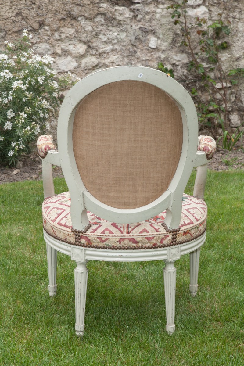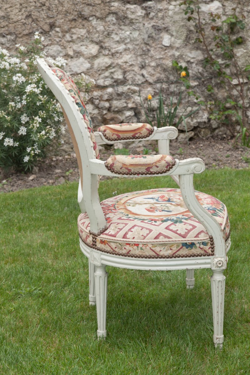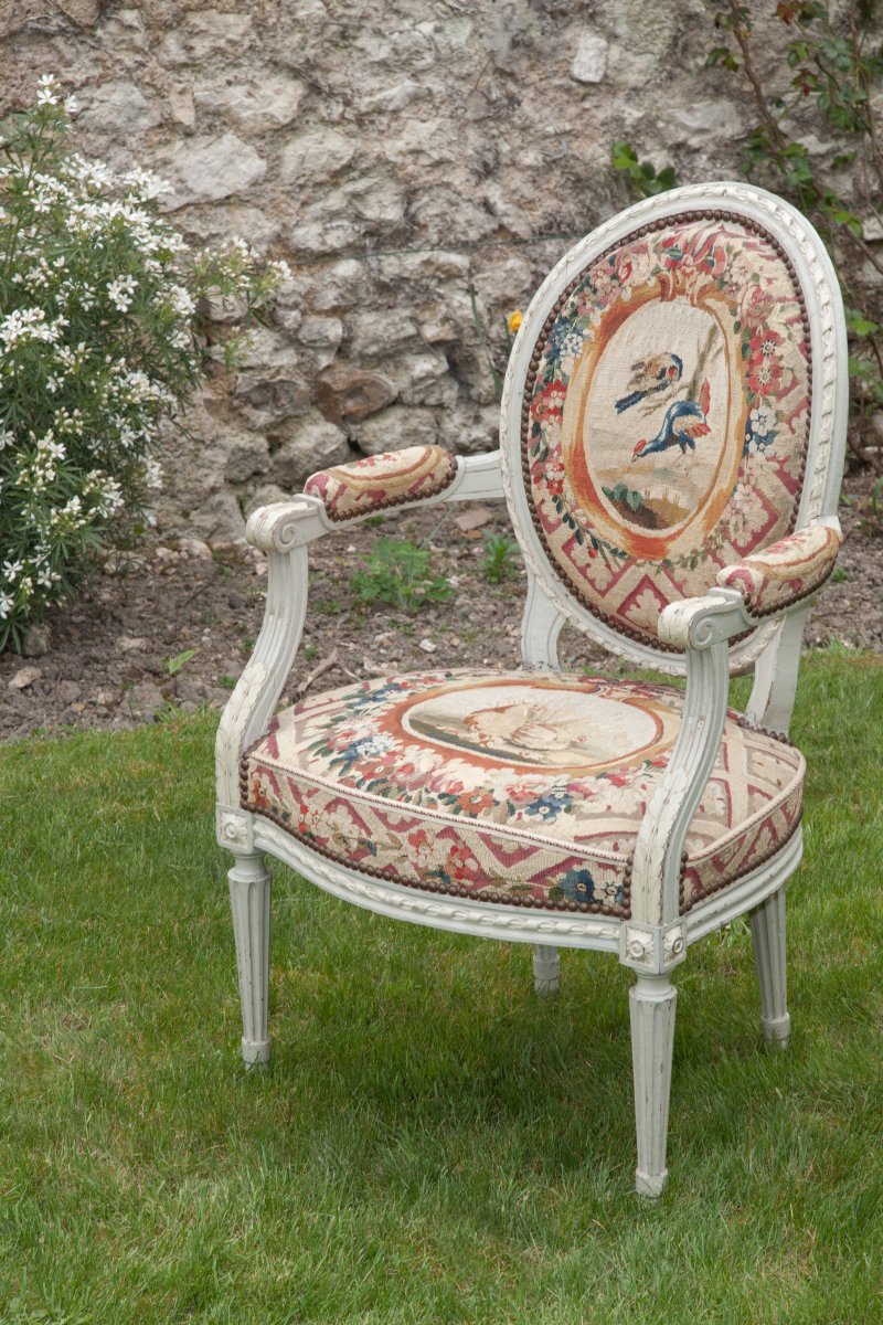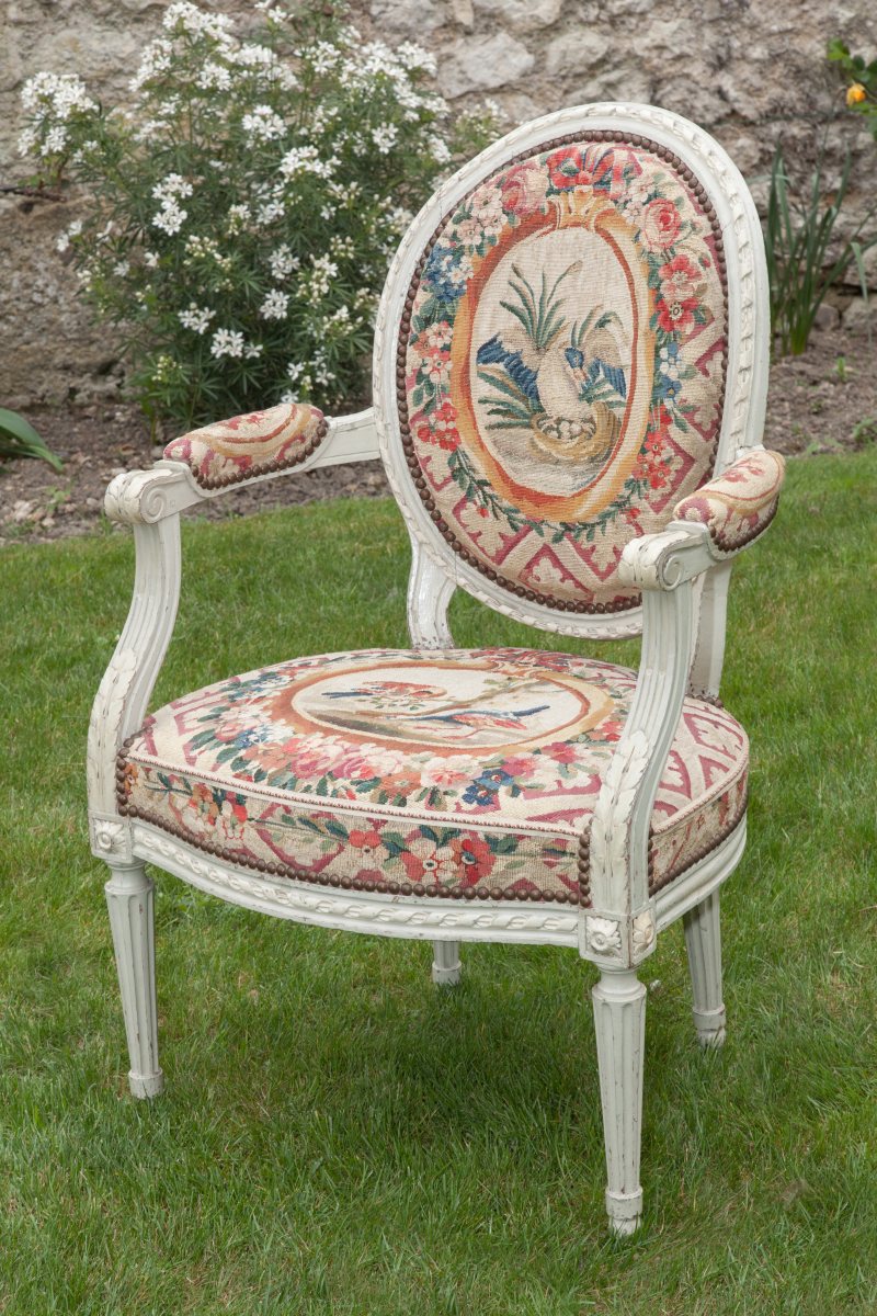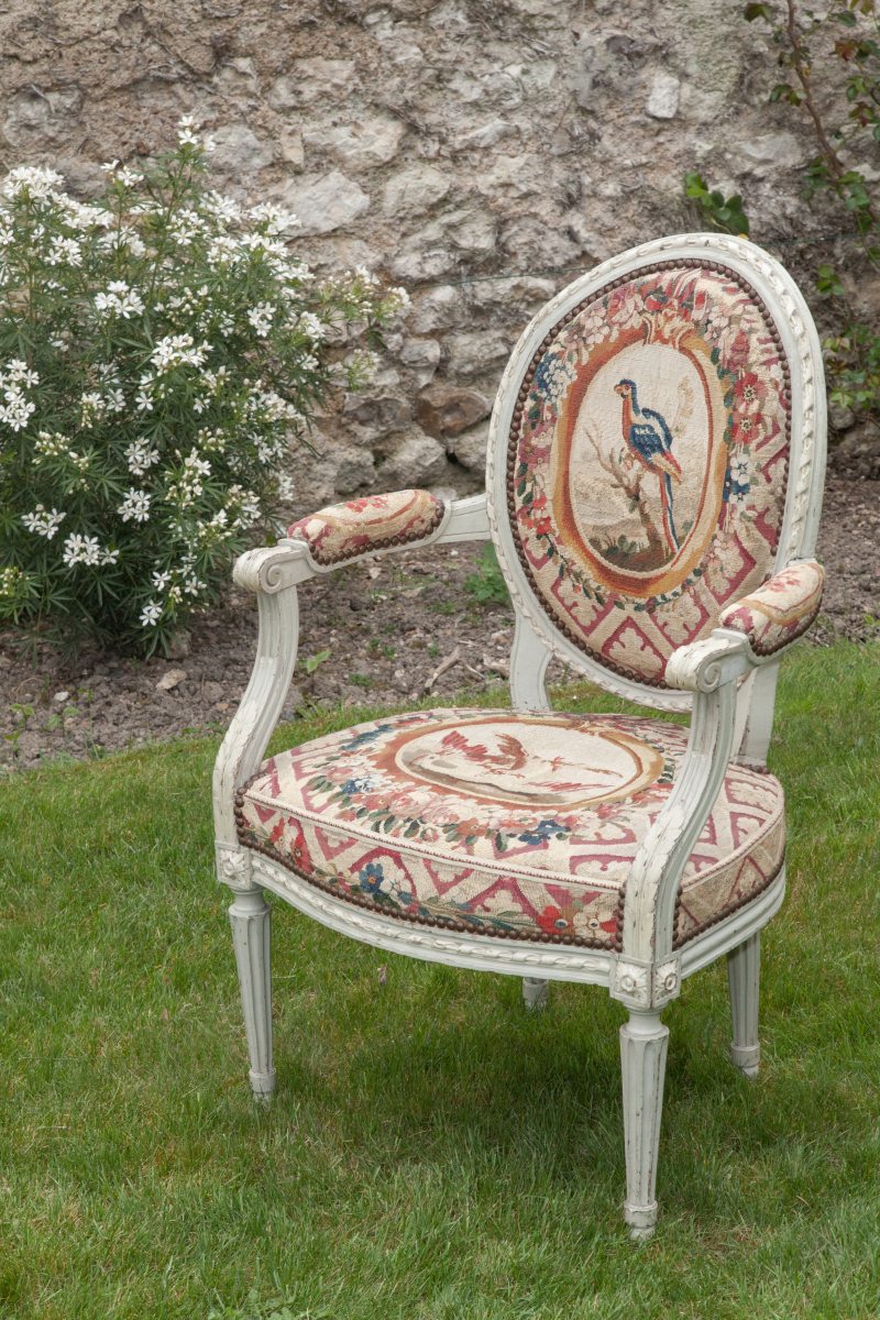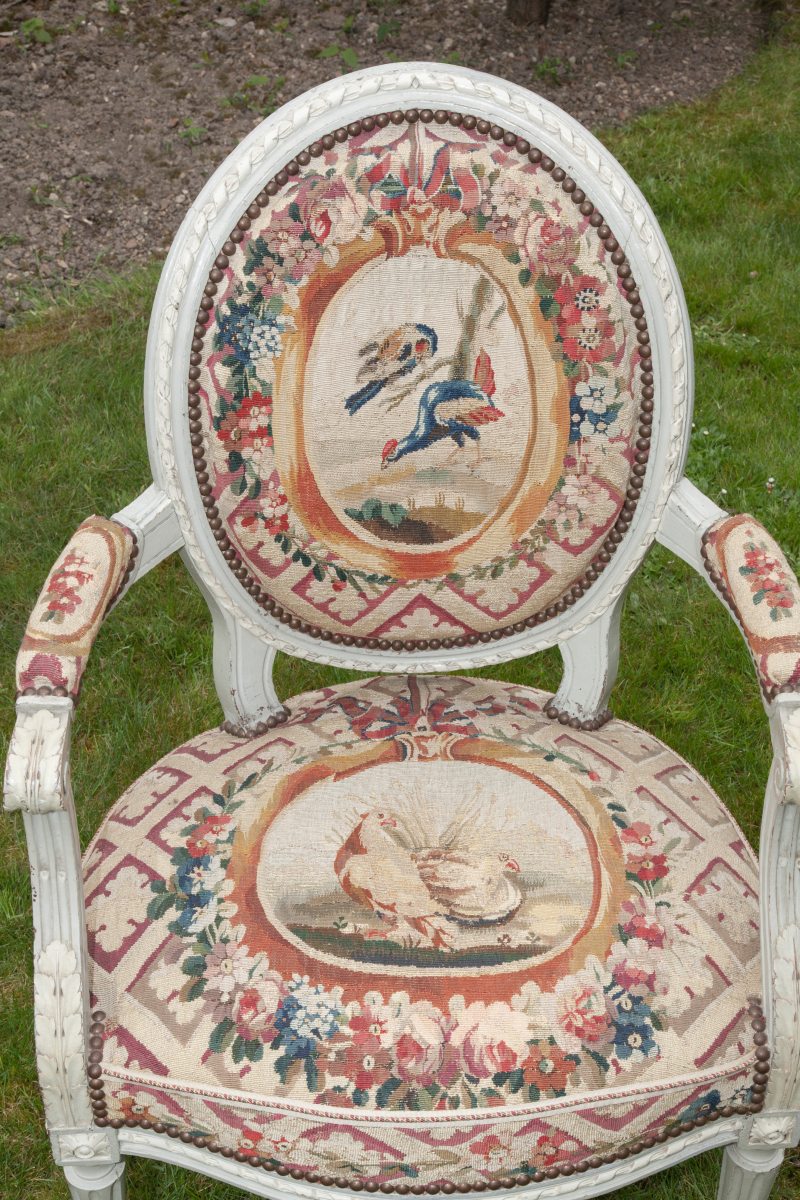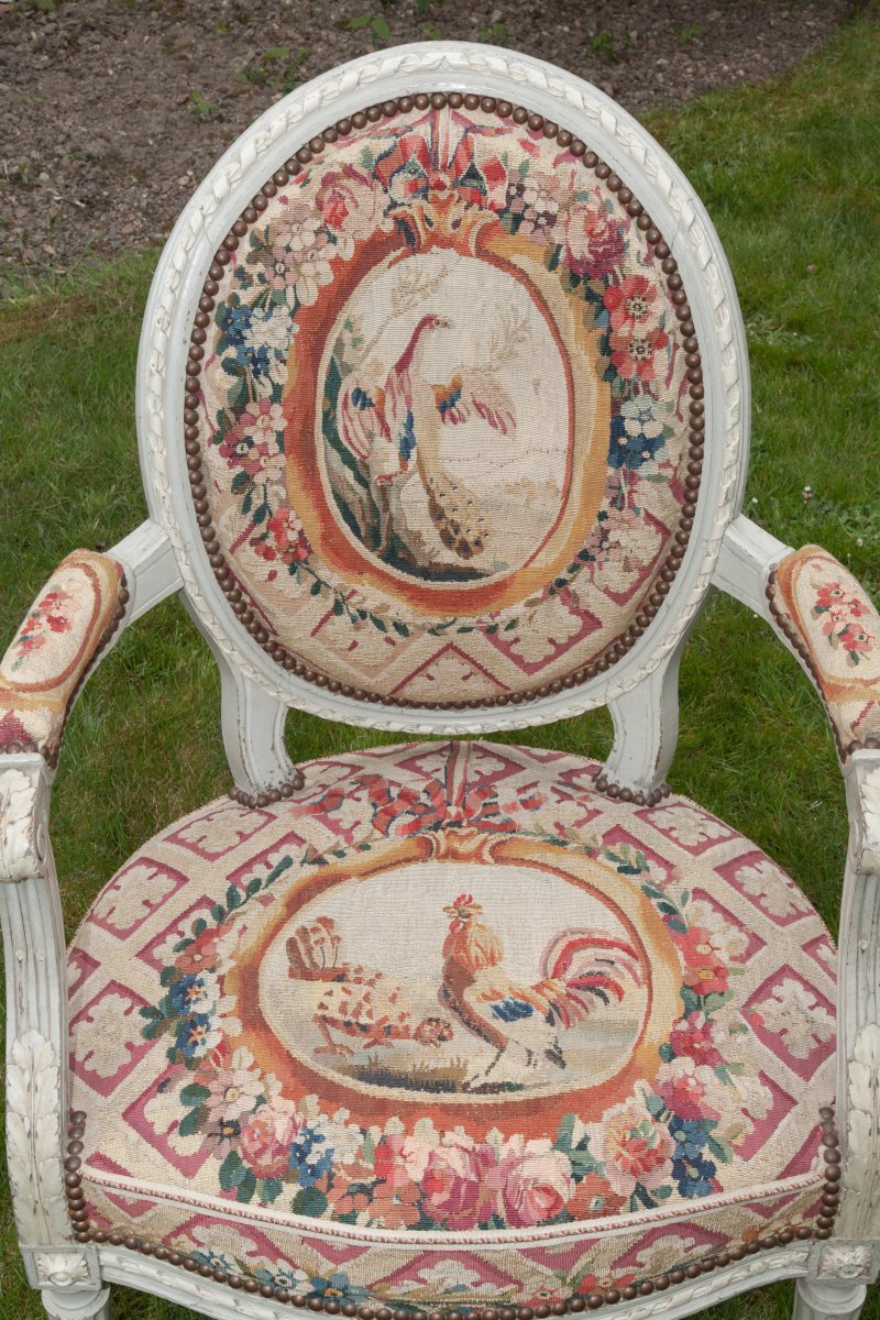 Six ARMCHAIRS and a BASKET COUCH in relacqered wood. Fresh and appealing upholstery tapestry representing exotic and domestic birds. Period: Louis XVI.