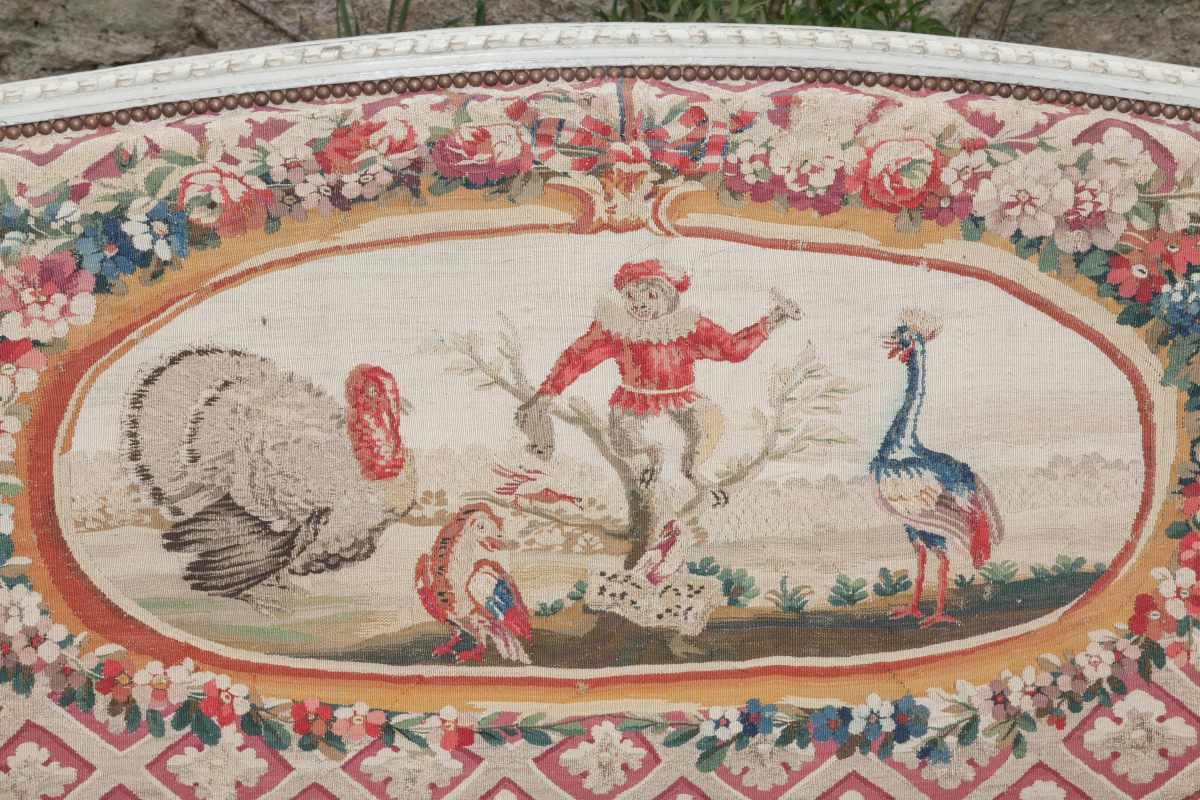 Avenante et fraîche tapisserie de Beauvais? aux volatiles exotiques et domestiques - le canapé agrémenté d'un singe costumé.