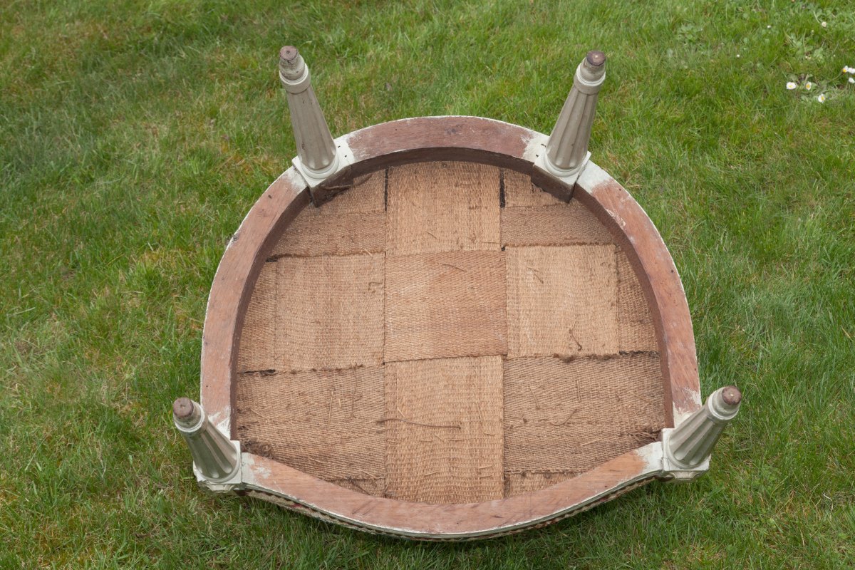 MOBILIER de SALON en bois naturel relaqué gris et crème de sept pièces. Il comprend SIX FAUTEUILS et UN CANAPÉ CORBEILLE. Modèle à dossier médaillon en cabriolet, mouluré et sculpté de feuilles d'acanthe et rubans, piètement à cannelures.