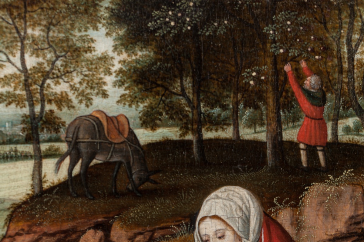 On notera au second plan l'iconographie relative au sujet de la fuite en Égypte. À droite, la chute des idoles: certaines représentations de la fuite en Égypte figurent une statue païenne tombée de son piédestal et brisée au passage du Christ enfant (Évangile du Pseudo-Matthieu). À gauche, la scène de la moisson miraculeuse: on y voit deux soldats demandant à des paysans en train de moissonner s'ils ont vu la Sainte-Famille.