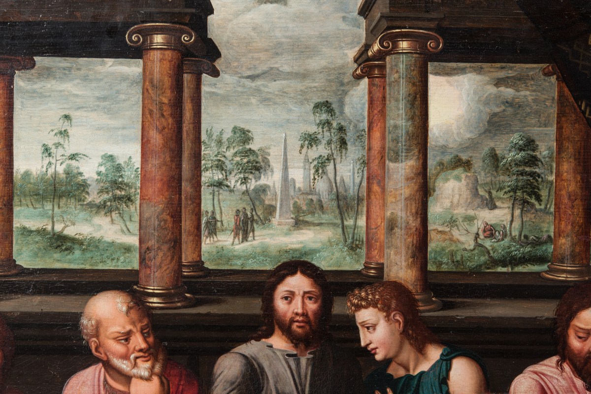 On peut rapprocher notre composition de l'une des nombreuses représentations de cette scène par Lambert Lombard, La Cène (panneau, 64 x 80 cm, vente anonyme, Londres, 12 juillet 1978 (Sotheby's), lot 96).On y retrouve également la même disposition de la Cène dans une salle largement ouverte sur les épisodes de la Passion.
