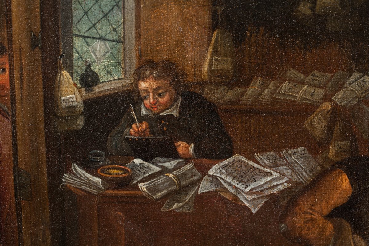 Longtemps, ce sujet a porté le titre traditionnel de "paiement de la dîme" ou "le percepteur d'impôts", mais une étude iconographique montre qu'il s'agit d'une satire du métier d'avocat, croulant sous les archives et les dossiers à traiter (les titres dans les inventaires du XVIIe siècle le décrivent sous le titre de "procureur"). L'avocat, reconnaissable à sa coiffe de docteur d'université, est représenté à droite avec la physionomie caractéristique des Habsbourg. Devant lui, les paysans timides et penauds apportent des victuailles. Au second plan, un clerc prend des notes, alors qu'à gauche un homme hésite à pousser la porte et un autre attend son tour.