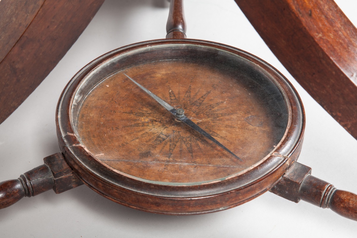Sphère reposant sur un anneau méridien divisé sur laiton, reposant sur un pied tripode en acajou mouluré et sculpté d'enroulements et flots. Les trois pieds supportent une boussole maintenue par trois traverses.
