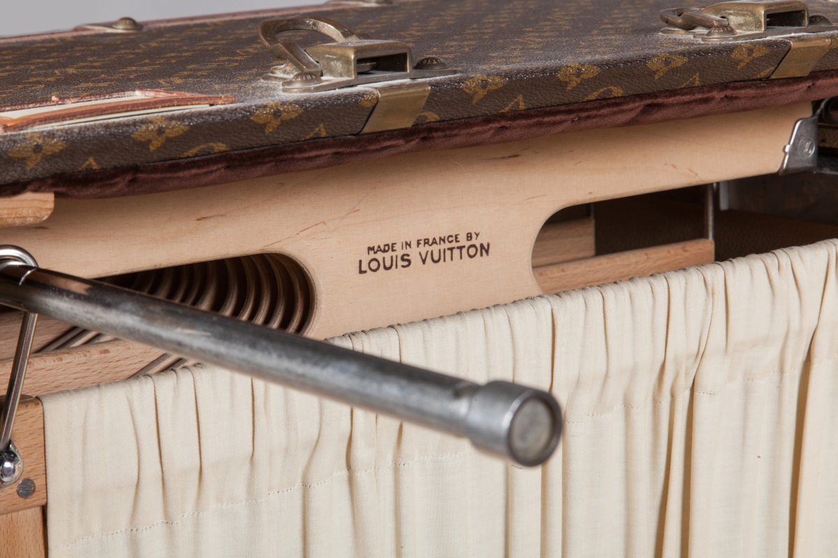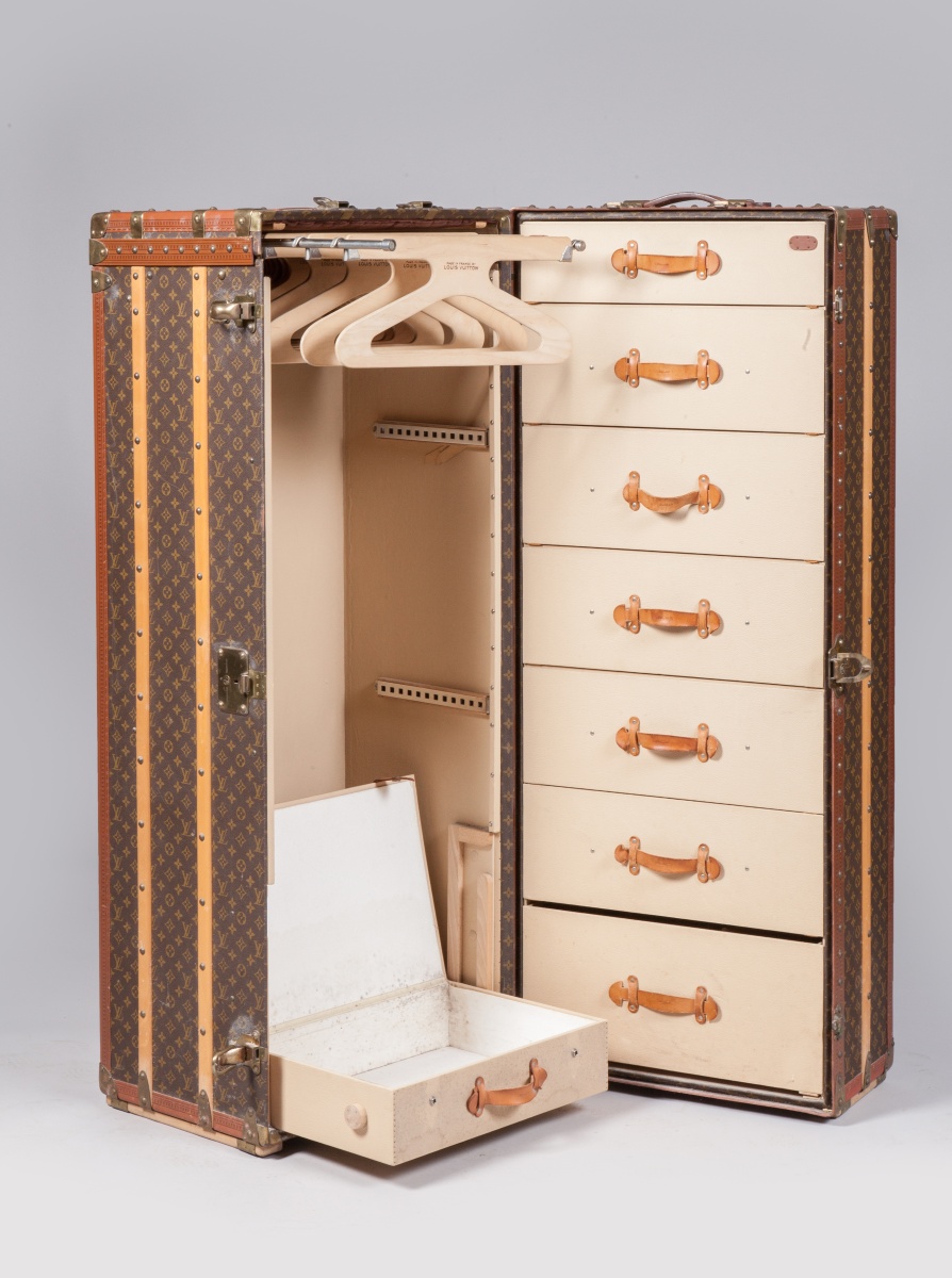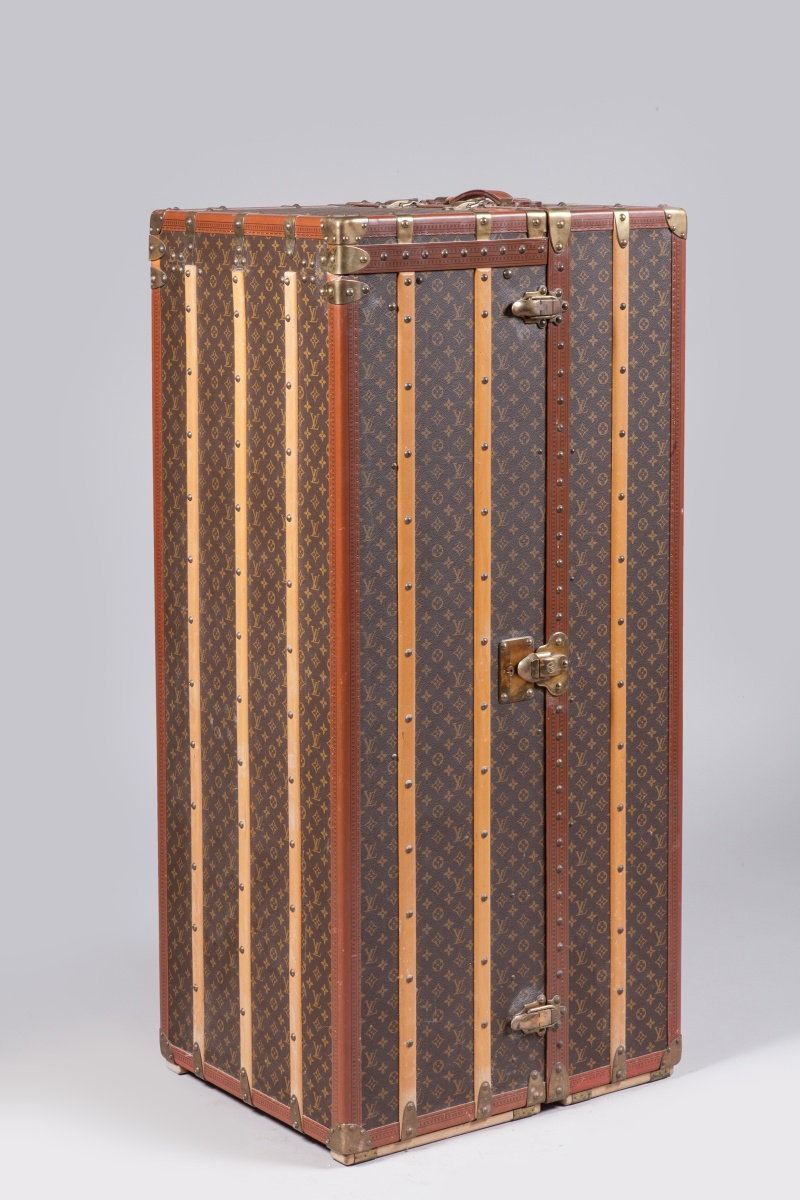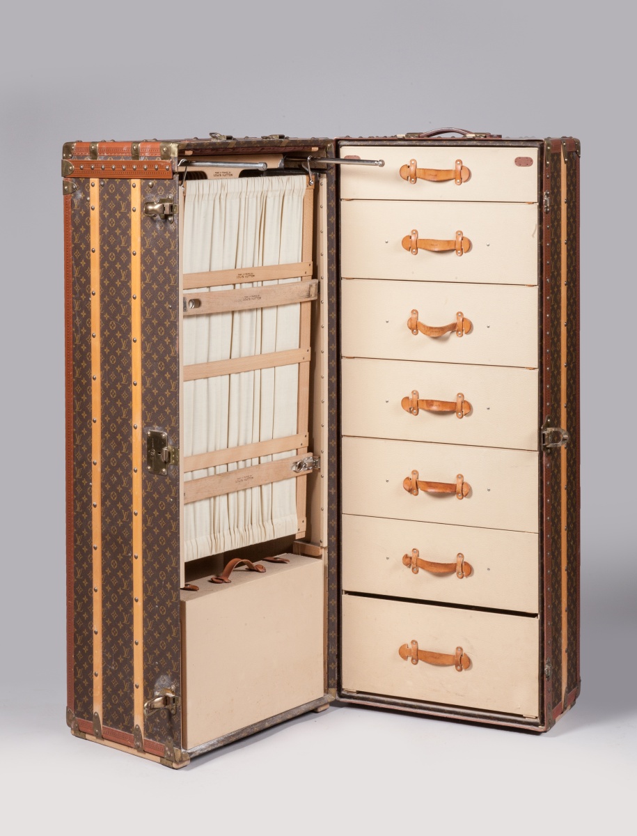 WARDROBE en toile monogrammée et renforts en hêtre. Bordures lozinées, écoinçons et fermetures en laiton doré. Poignées en cuir. Intérieur doublé de vuittonite beige ouvrant d'un côté à sept tiroirs et formant penderie munie d'une mallette à chaussures amovible de l'autre. Ouverture par le dessus.