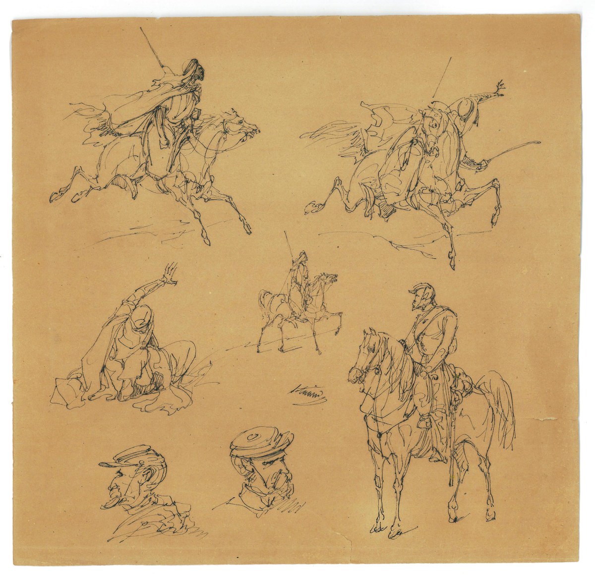 Esquisses de cavaliers français et arabes pour une scène de la conquête de l'Algérie.