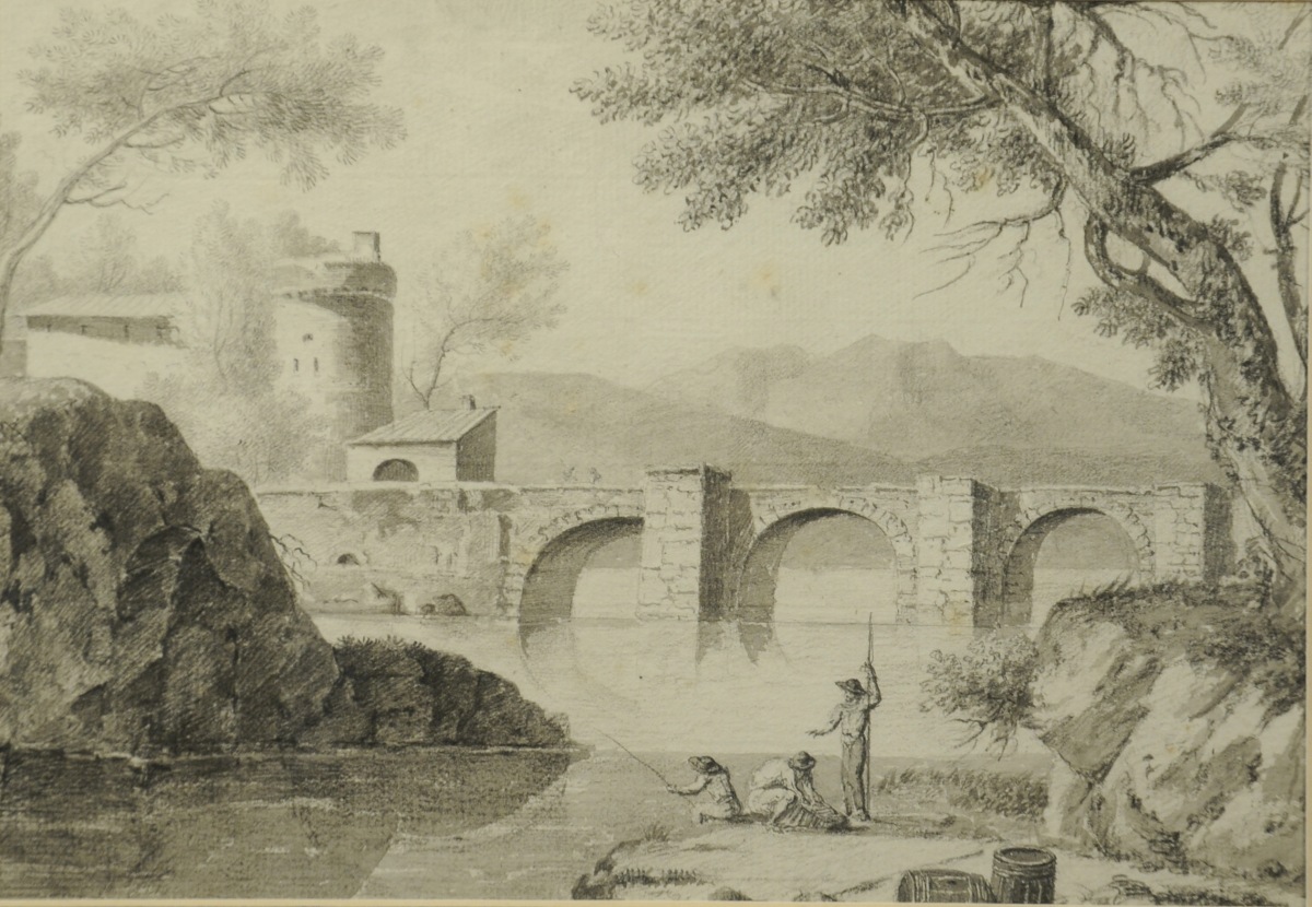 - Pêcheurs au bord d'une rivière traversée par un pont.