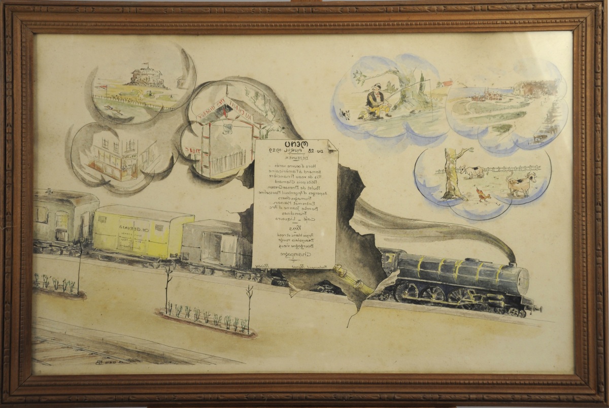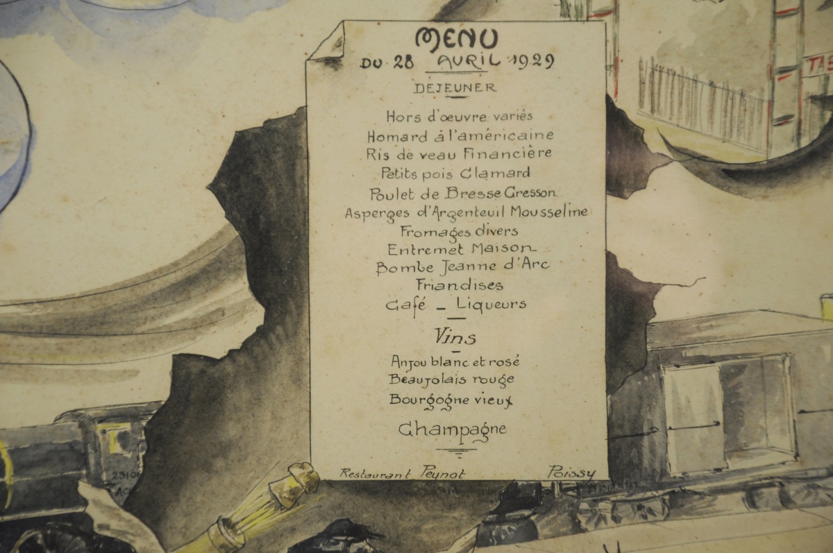"MENU DU 28 AVRIL 1929 / Restaurant Peynot / Poissy". Dessin à l'encre de Chine et l'aquarelle, monogrammé en bas à droite et daté 28.11.28.
