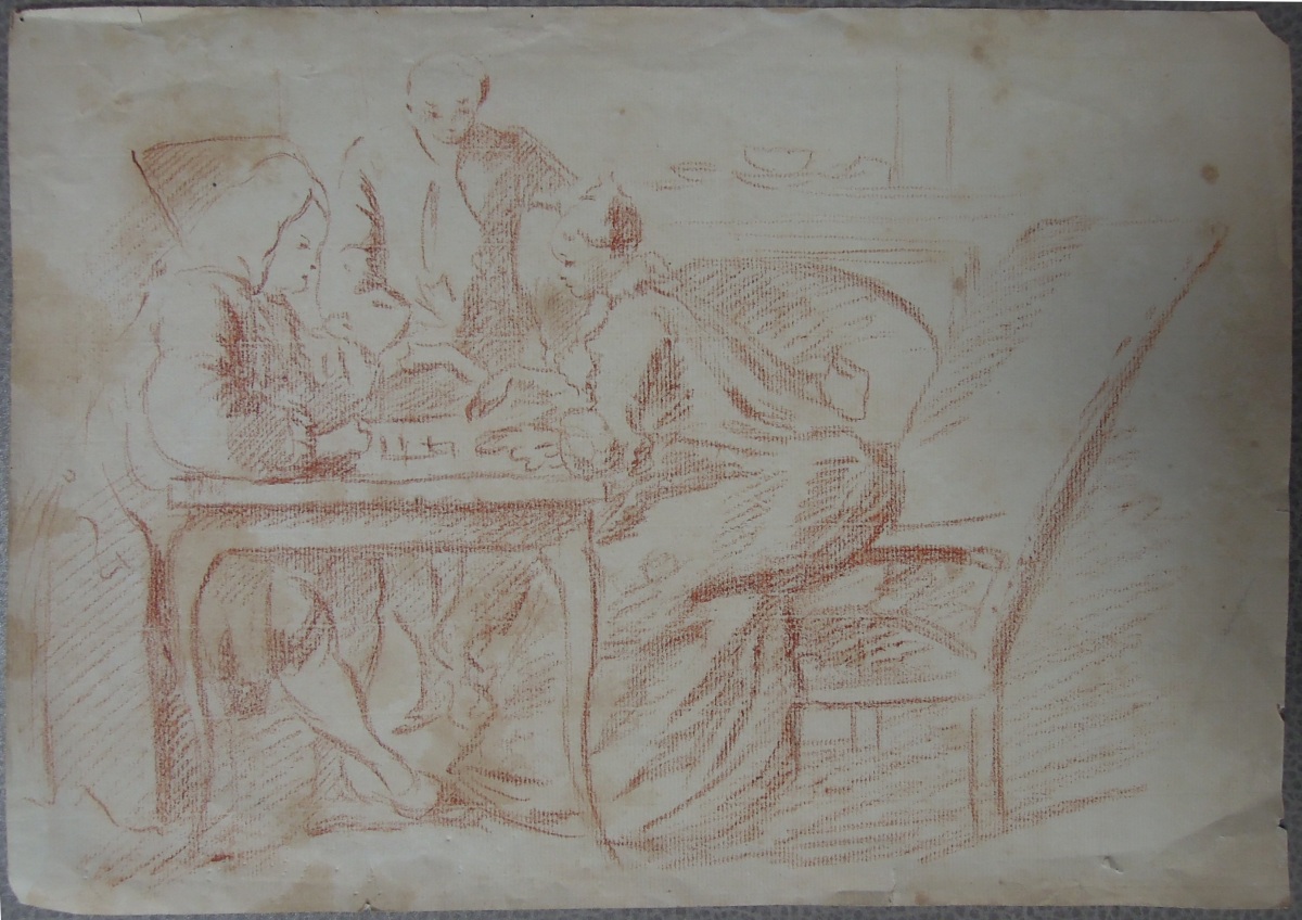 - École française moderne, La partie de carte, Sanguine (26 x 36,5 cm).