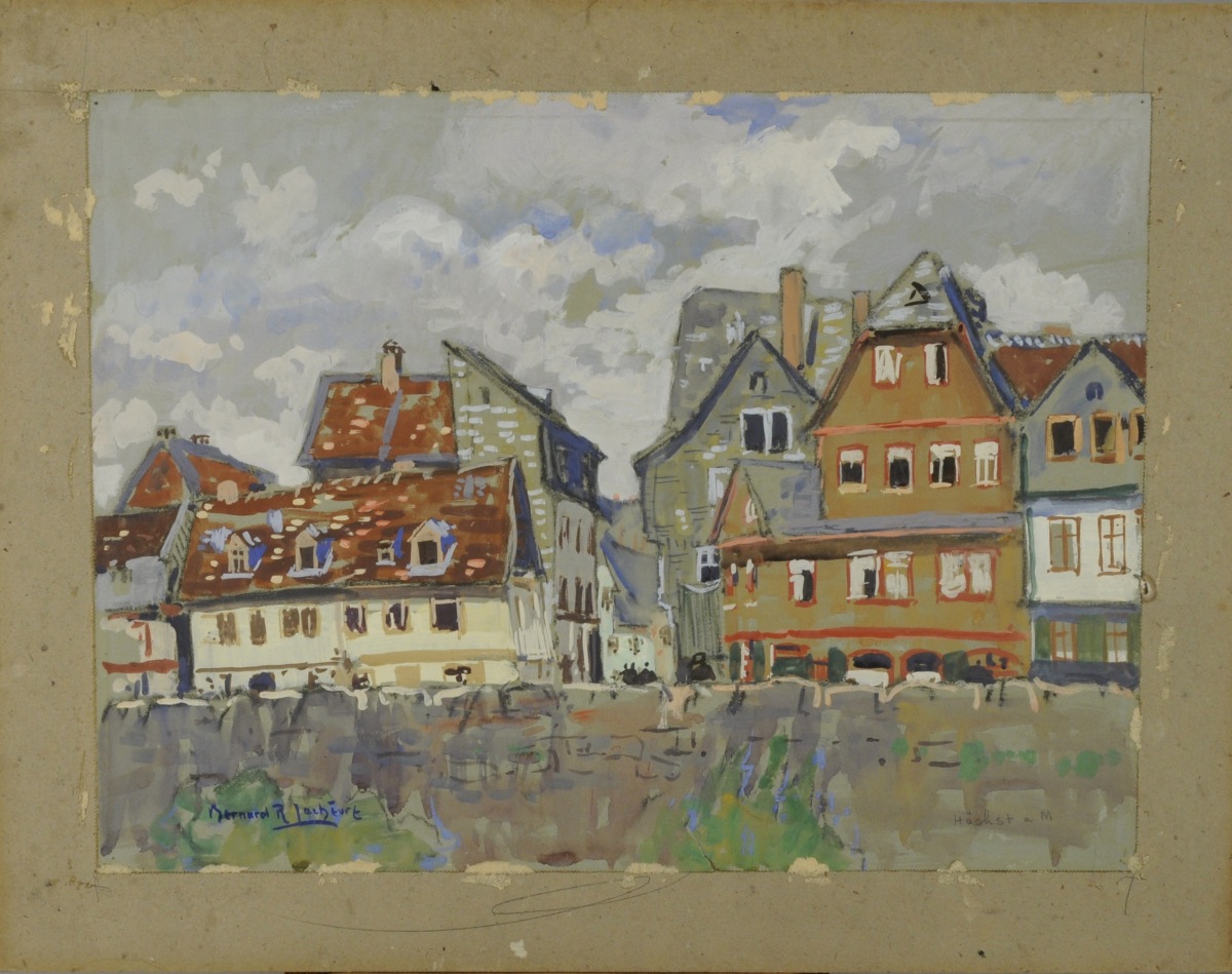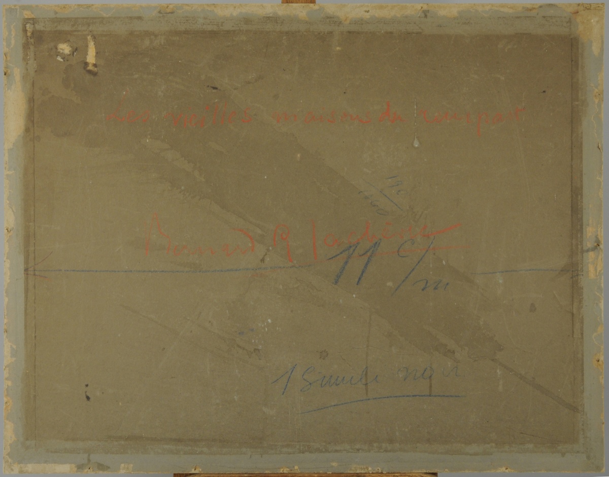 Aquarelle et gouache marouflée sur carton, signée en bas à gauche et titrée en bas à droite. Porte une inscription " Les vieilles maisons du rempart / Bernard R. Lachèvre / 1 [..] noir "