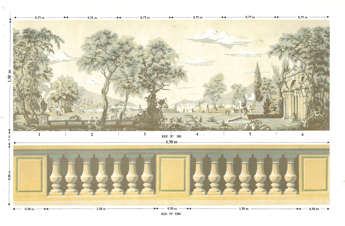 Ensemble complet des 6 lés de papier peint panoramique (lés 1 à 6) représentant une terrasse romaine en grisalle (références 502 beige).