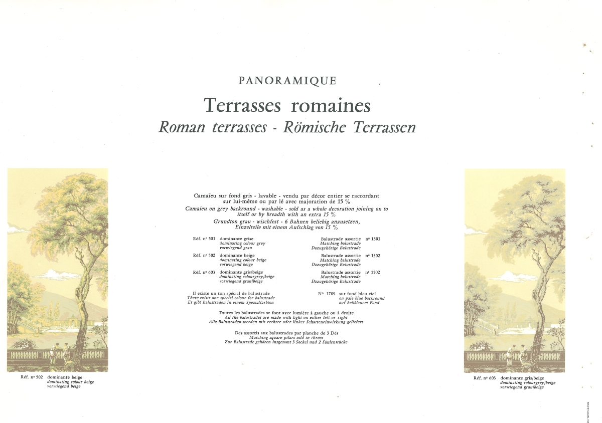 4 lés (lés 1-2-5-6) de papiers peints panoramiques représentant une terrasse romaine en grisaille (références 502 beige).