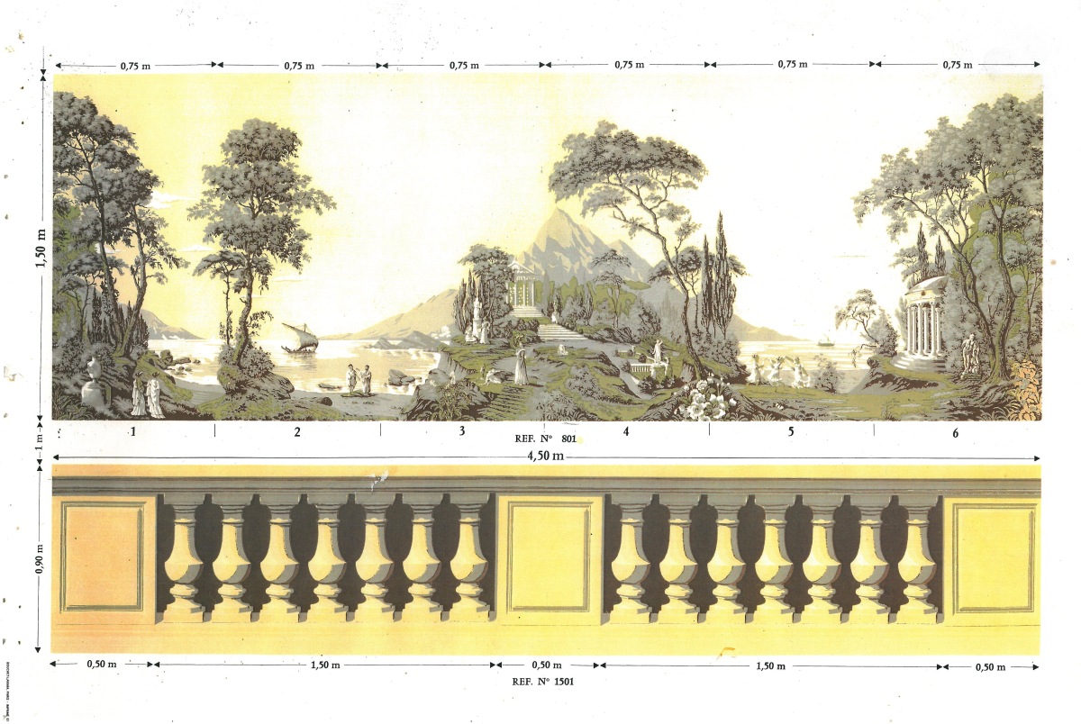 4 lés (comprenant 1 lé numéro 2 et 3 lés numéro 5 de papiers peints panoramiques représentant la Grèce