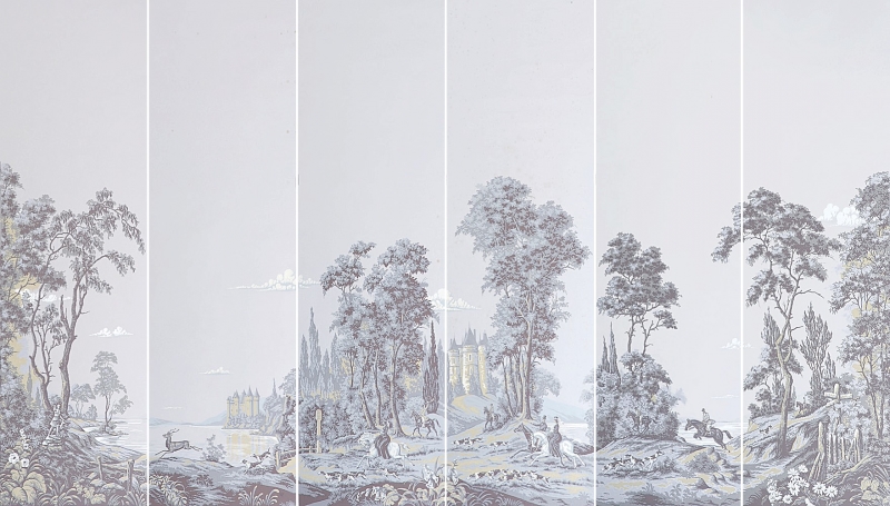 4 lés (lés 2-3-4-6) de papiers peints panoramiques représentant une chasse