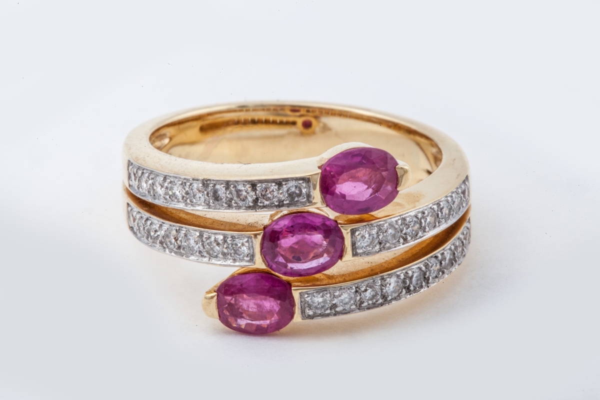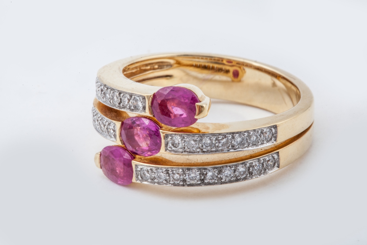RING in yellow gold with three oval rubies.