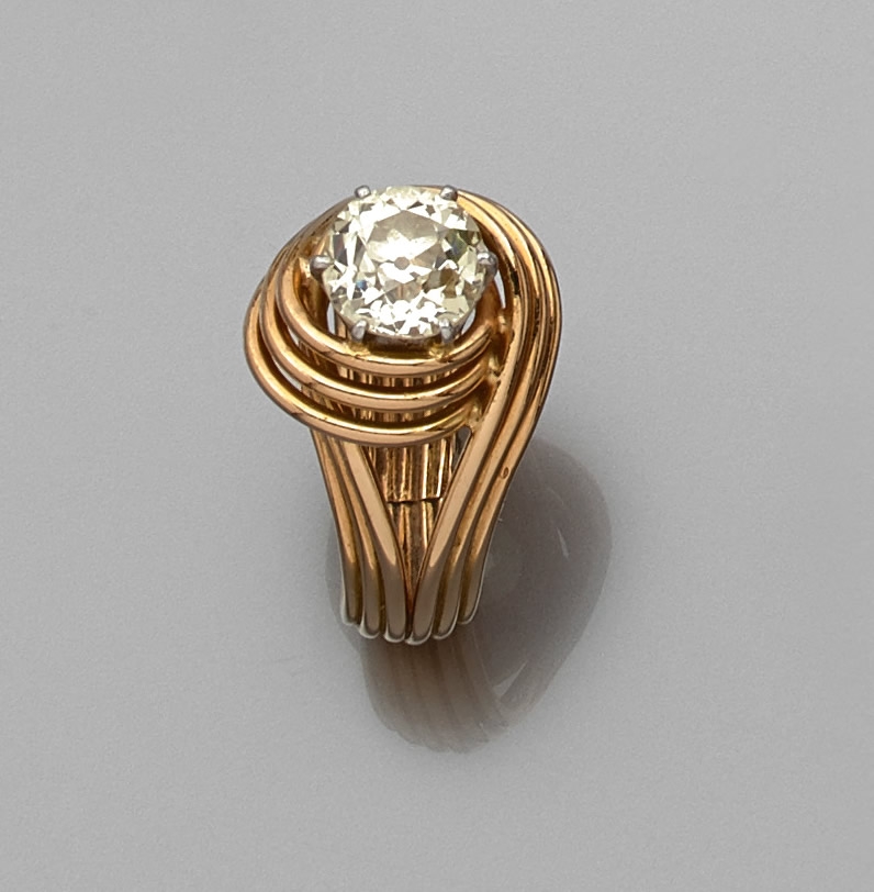BAGUE composée de trois fils d'or jaune 18K 750 millièmes et platine entrelacés, le centre orné d'un DIAMANT rond de taille ancienne.