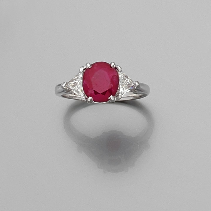 Grey gold RING set with a cushion-shaped ruby between two trilliant-cut diamonds.