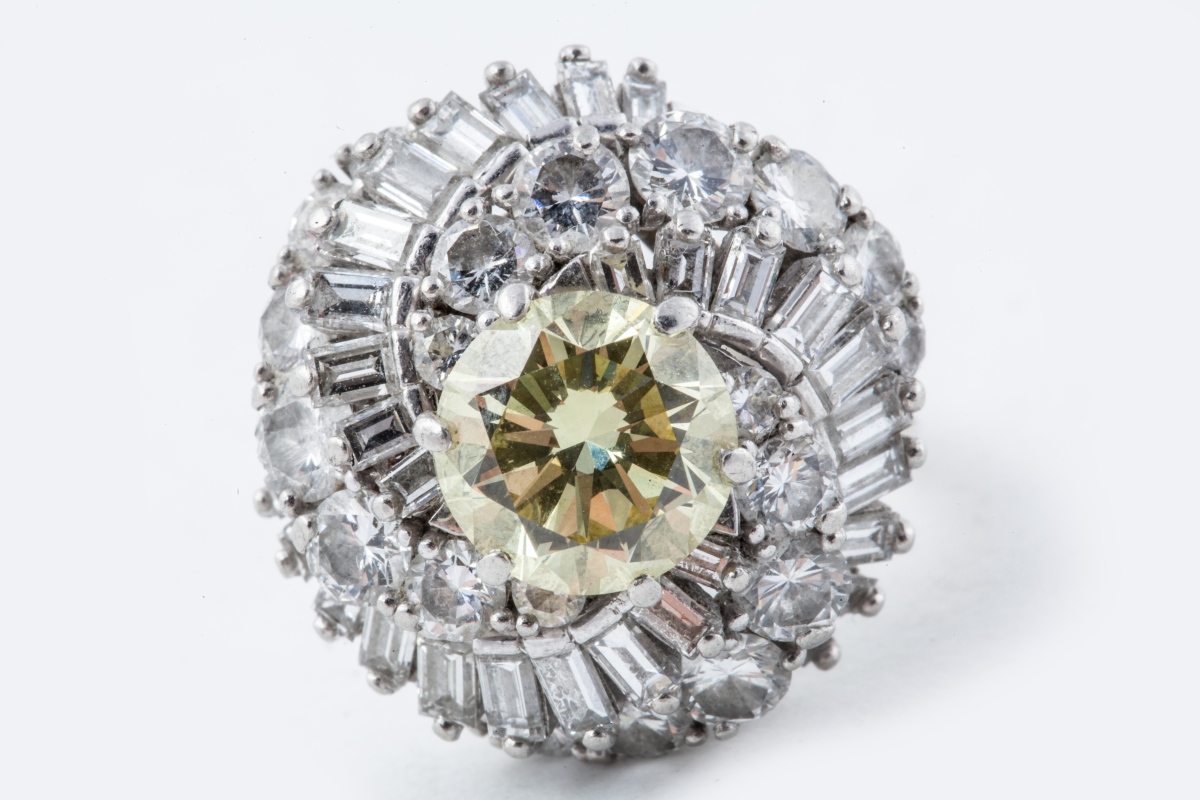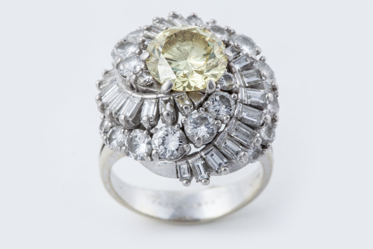 Platinium and grey gold DIAMOND RING set with a yellow fantasy diamond.