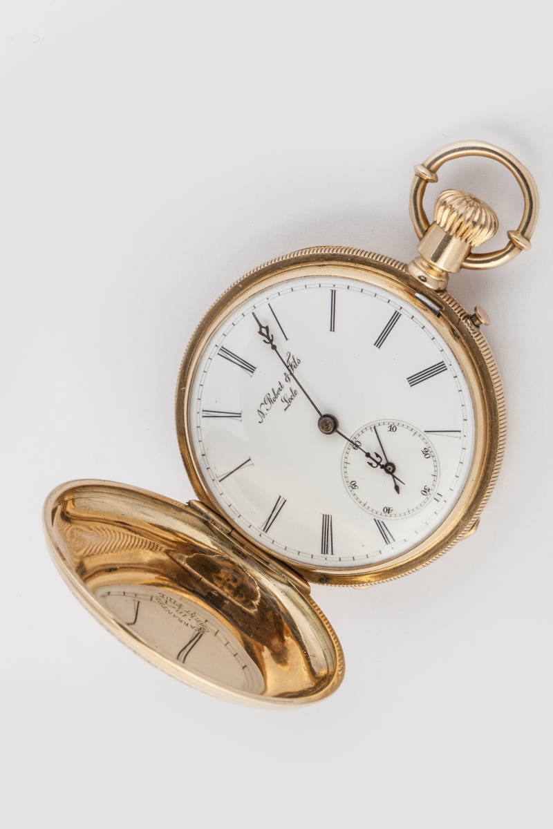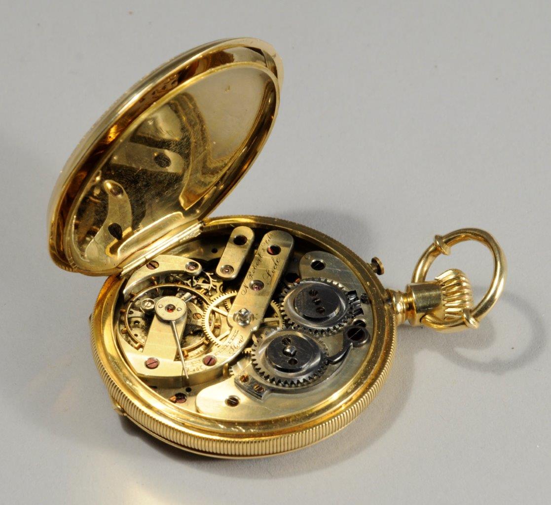 MONTRE remontoir en or jaune. Double boitier guilloché amati, à décor de feuillages sur les pourtours émaillé noir, et cartouche central. Double cadran émaillé (heures/minutes en chiffres romains et secondes) signé N. Robert et fils. Locle. Mouvement signé sur le cache mouvement et sur le mécanisme même: n°19090 Numa Robert et fils Locle.